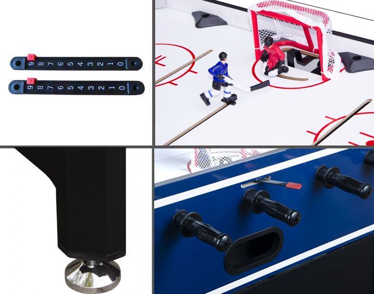 На ножках крепкие хромированные опоры для установки на неровных поверхностях. Бортики у стола высокие, что предотвращает вылет шайбы за пределы стола.
