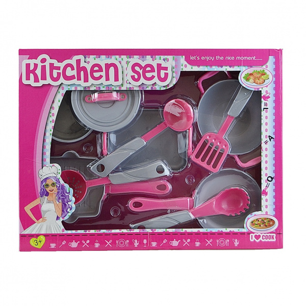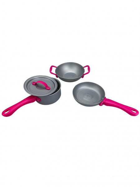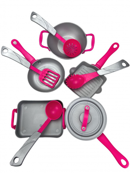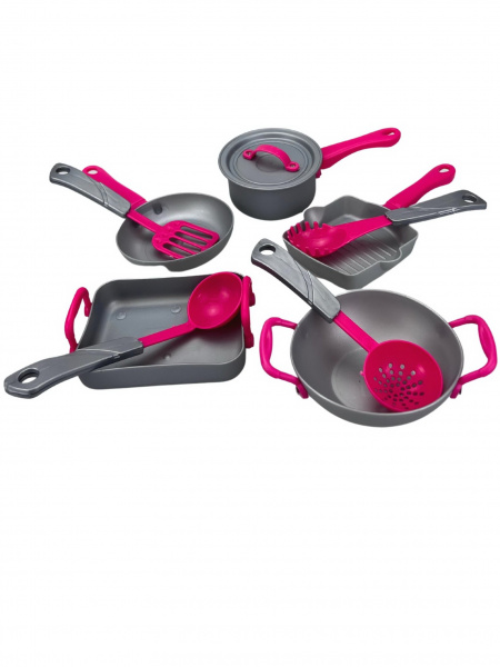 Набор посуды выполнен в серо-розовых тонах, имитирующих сталь. Такой набор дополнит любую детскую кухню и вдохновит детей на новые сюжеты для игр. Сюжетно-ролевые игры — важная часть развития ребёнка. Они помогают освоить новые социальные роли и стимулируют развитие воображения.