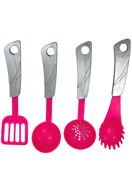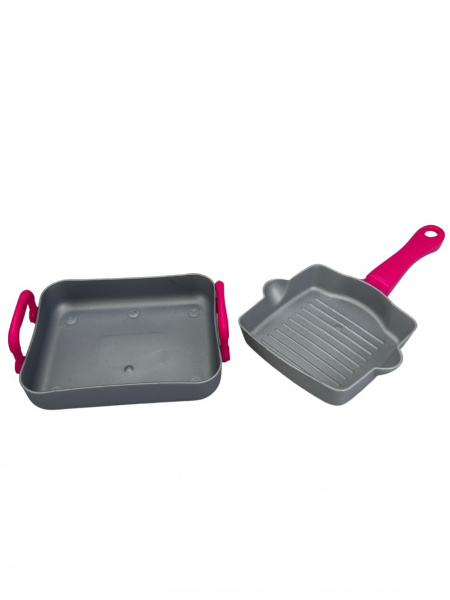 В наборе представлены самые необходимые виды посуды: сковорода, сотейник, сковорода-гриль, ковш с крышкой, прямоугольная форма с ручками и кухонные принадлежности -  половник (поварешка), шумовка, лопатка, ложка для спагетти.