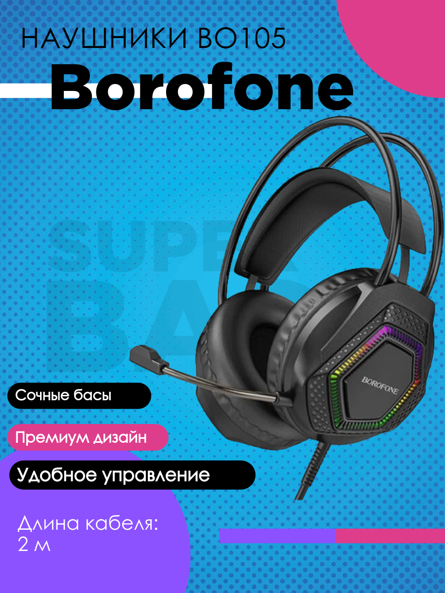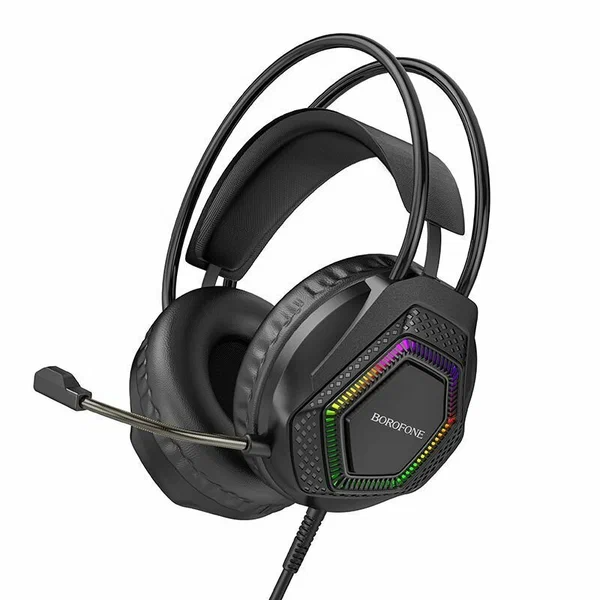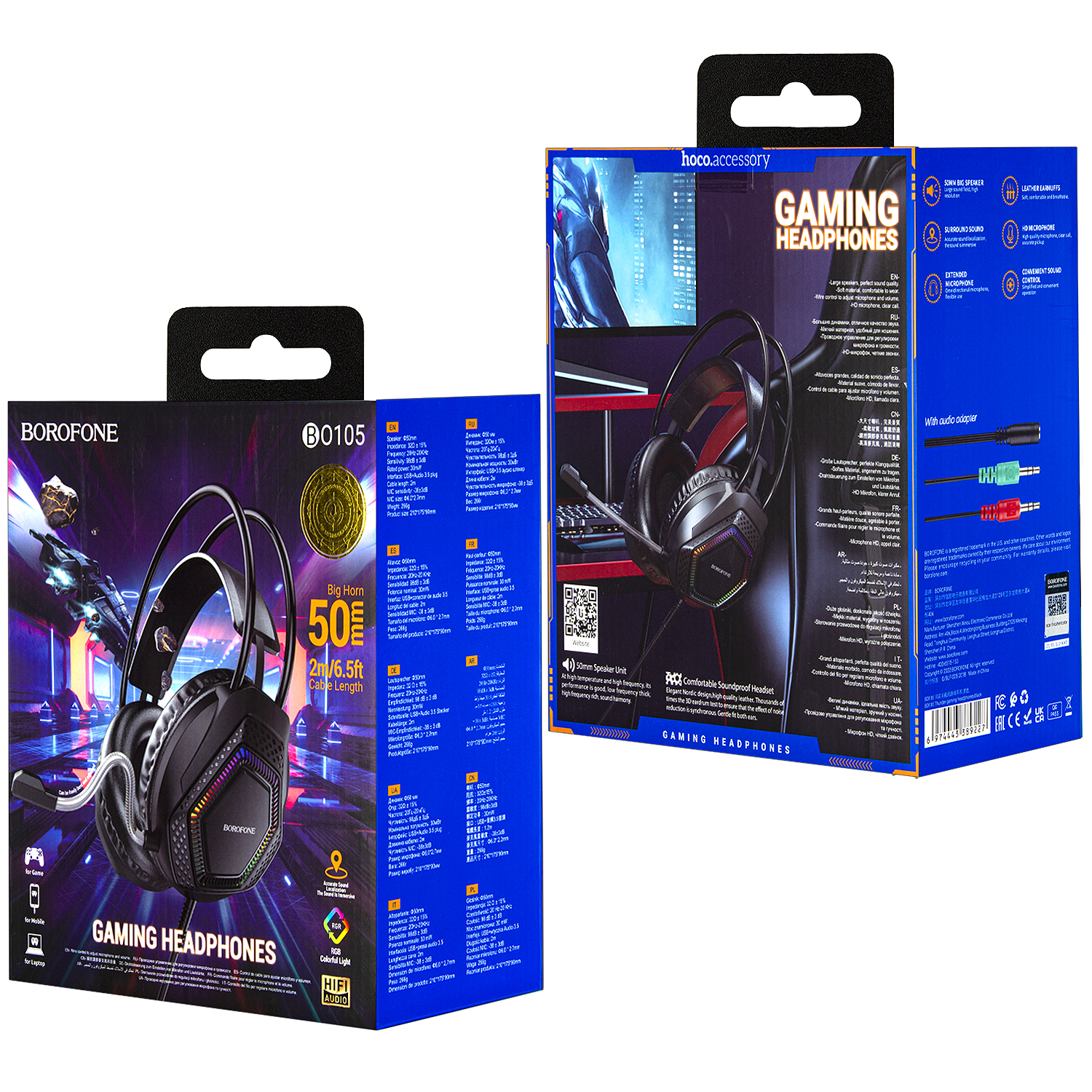 BOROFONE BO105 - игровые проводные накладные наушники с микрофоном, трехцветная LED подсветка, с кабелем аудио-адаптером 2-в-1 длиной 2.2 м.