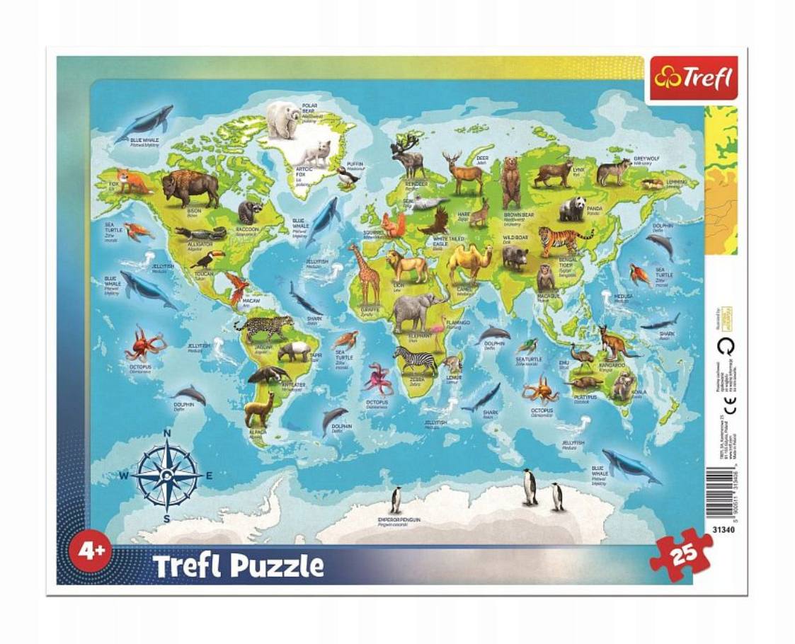 Пазл Trefl 25 деталей: Карта мира с животными (в рамке), 31340