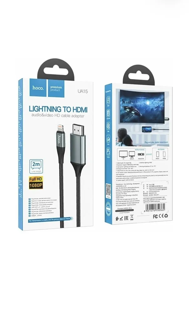 UA15 кабель Lightning на HDMI, поддерживает HD вывод 1080p, plug and play, 2м