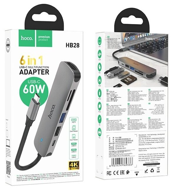 Переходник Type-C Hoco HB52 (HDTV+RJ45+SD/TF+PD+Type-C3.0+USB3.0) 2 147 руб. / шт.