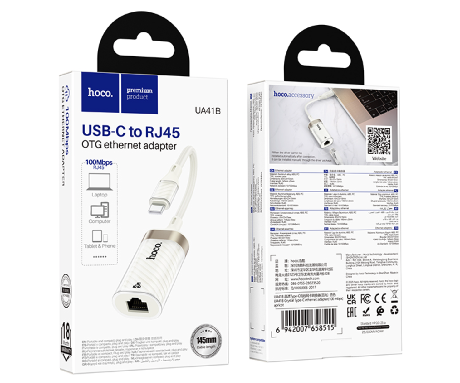 Hoco UA41B станет отличным решением для пользователей, которым требуется надёжное проводное подключение к сети Интернет на ноутбуках, планшетах или других устройствах с портом Type-C. Благодаря поддержке стандартов 10/100Mbps, адаптер обеспечивает стабильную передачу данных для повседневных задач.