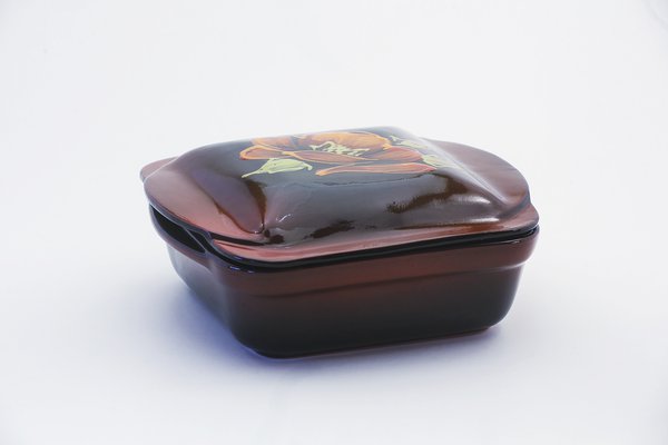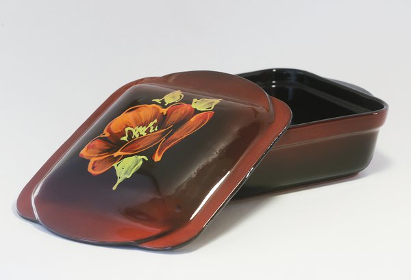 С подглазурной росписью. Можно использовать с духовке, микроволновой печи.