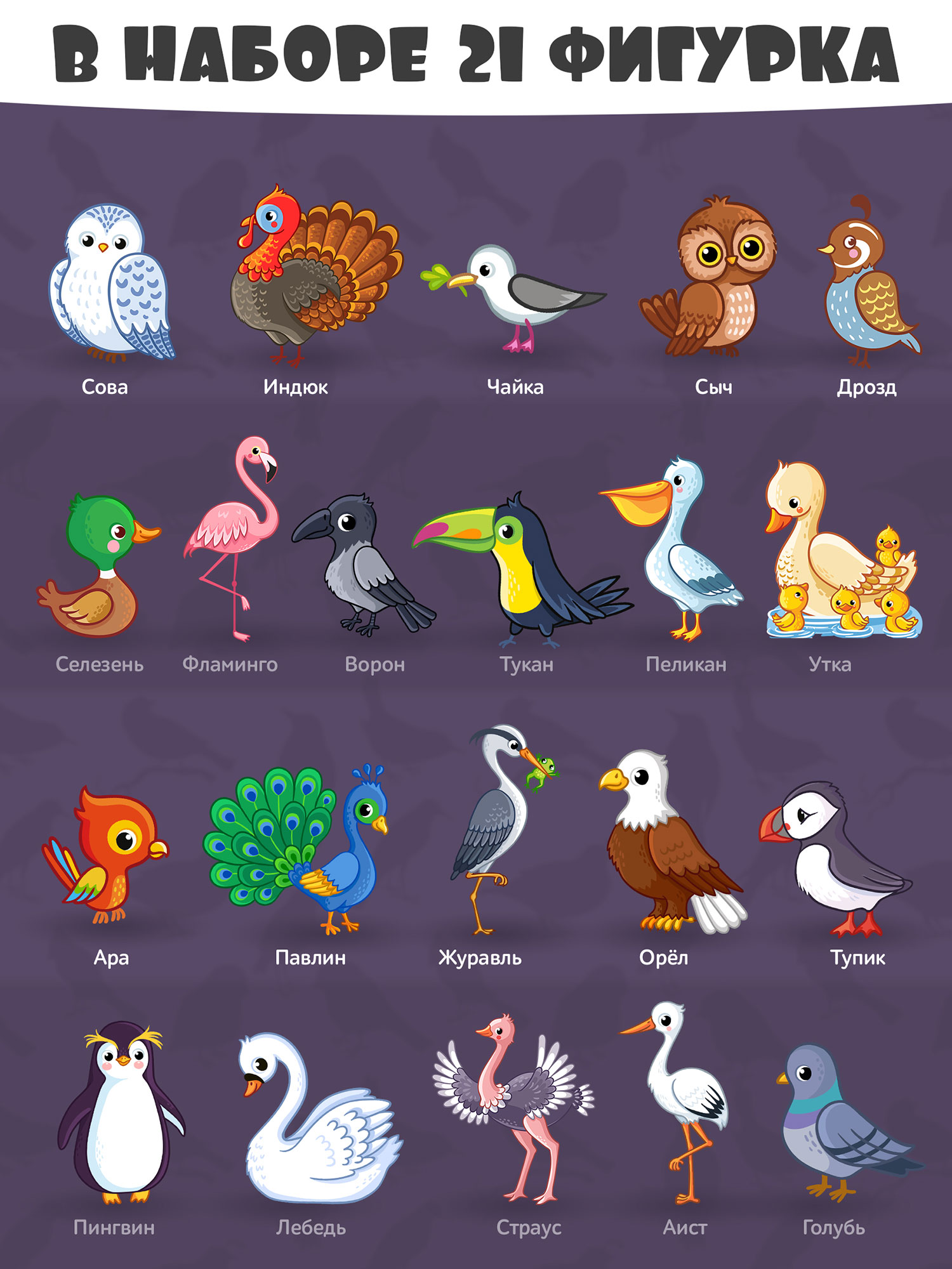 В комплекте вы найдёте 21 фигурку высотой от 4 до 10 см, которые помогут детям изучать мир птиц и развивать свои навыки.