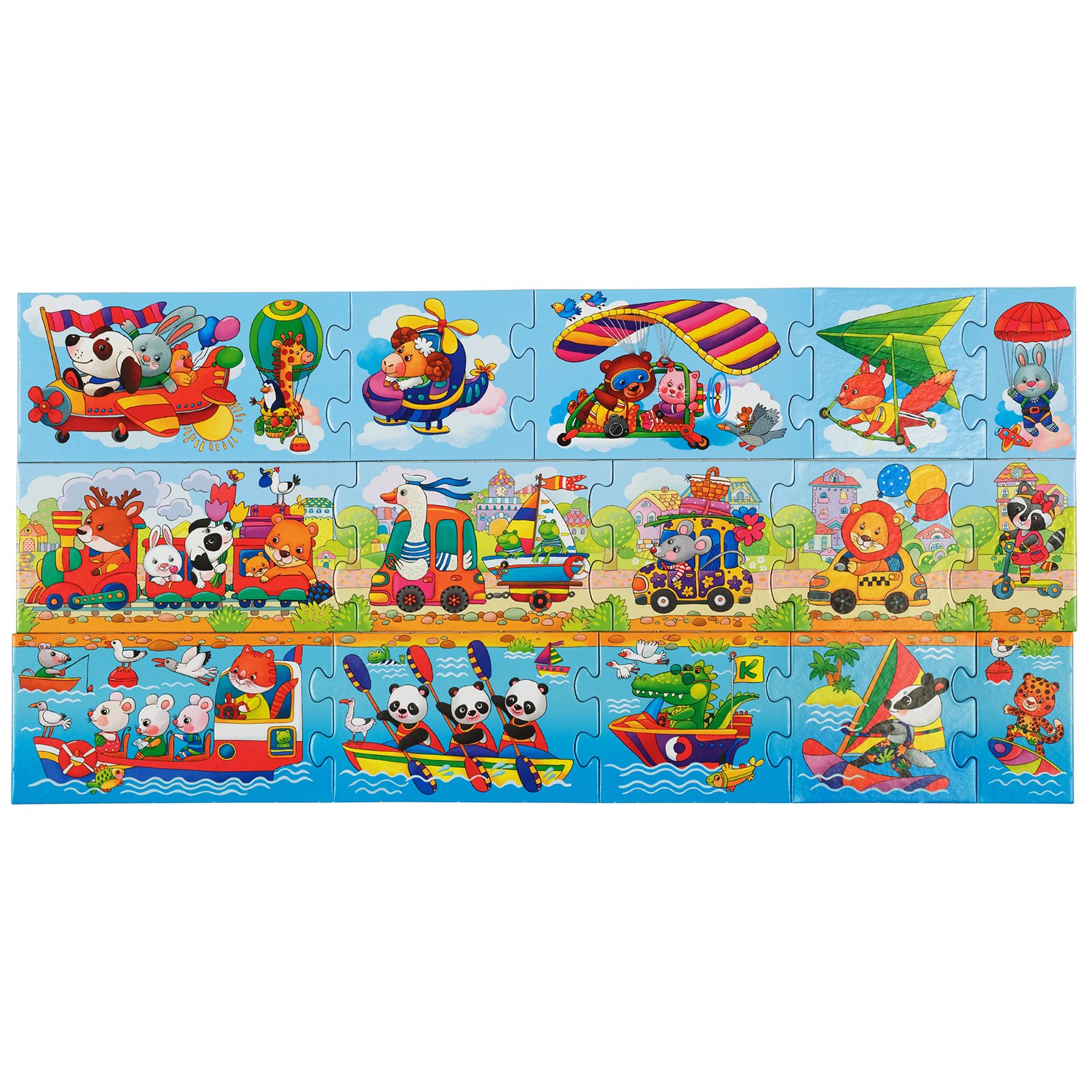 В наборе 15 деталей с изображением наземного, водного и воздушного транспорта. Нужно собрать каждый вид транспорта в свой пазл, а затем сложить их в одну картинку. Детали можно менять местами.