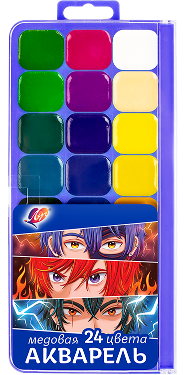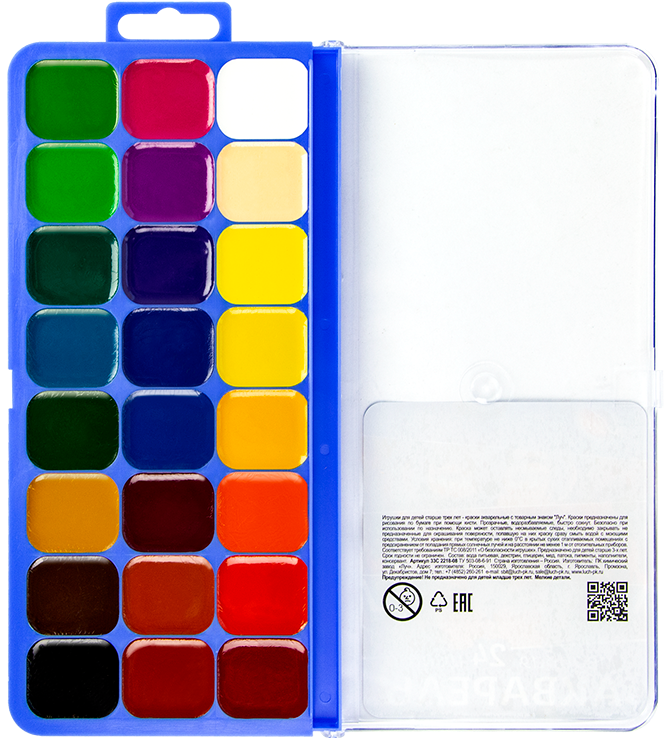 В наборе 24 цвета:белила, желтая, желтая темная, оранжевая, алая, розовая, светло-зеленая, изумрудно-зеленая, голубая, фиолетовая, коричневая, черная.