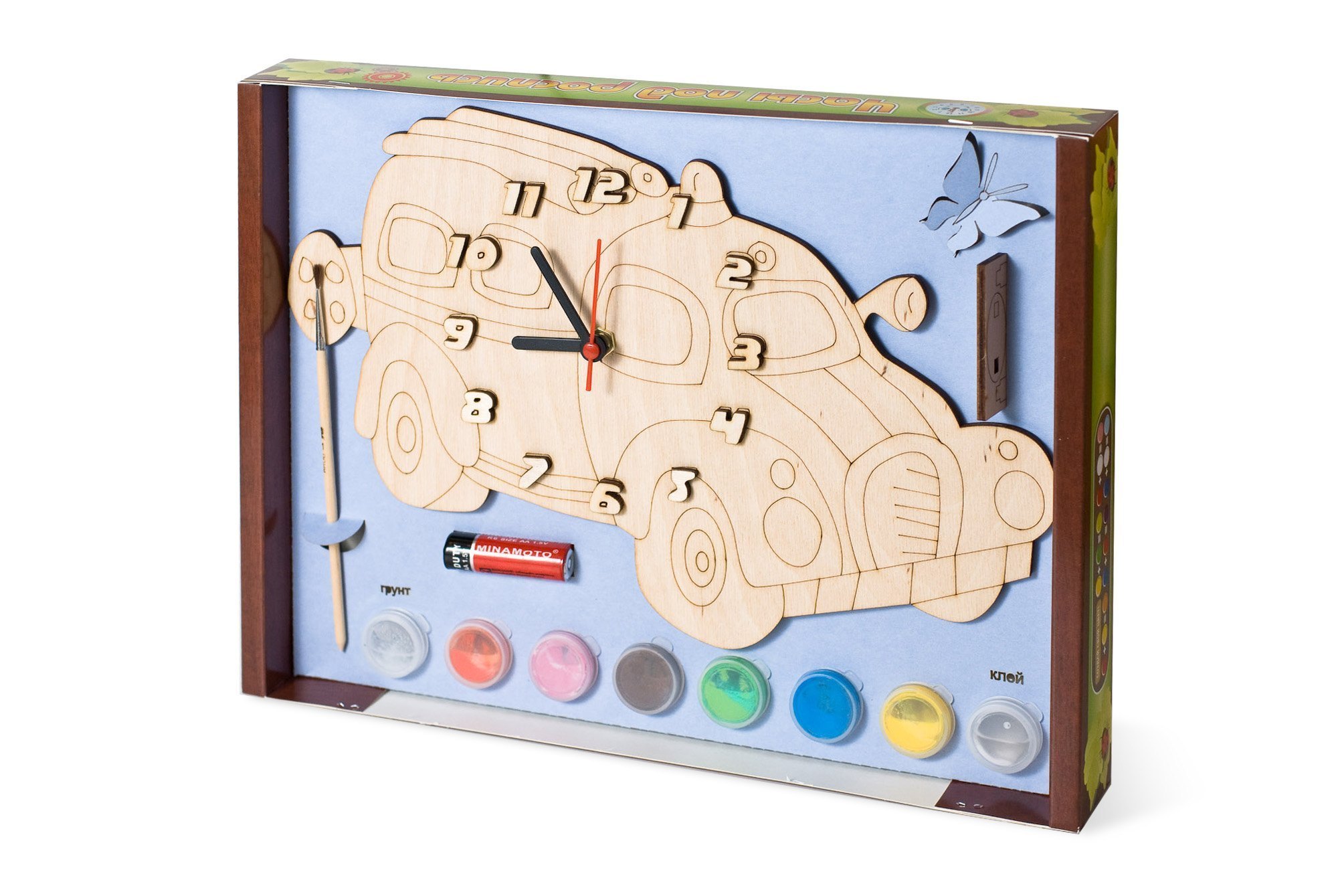 Дети с удовольствием раскрасят деревянную основу из набора, выполненную в виде машинки с циферблатом и стрелками на корпусе.