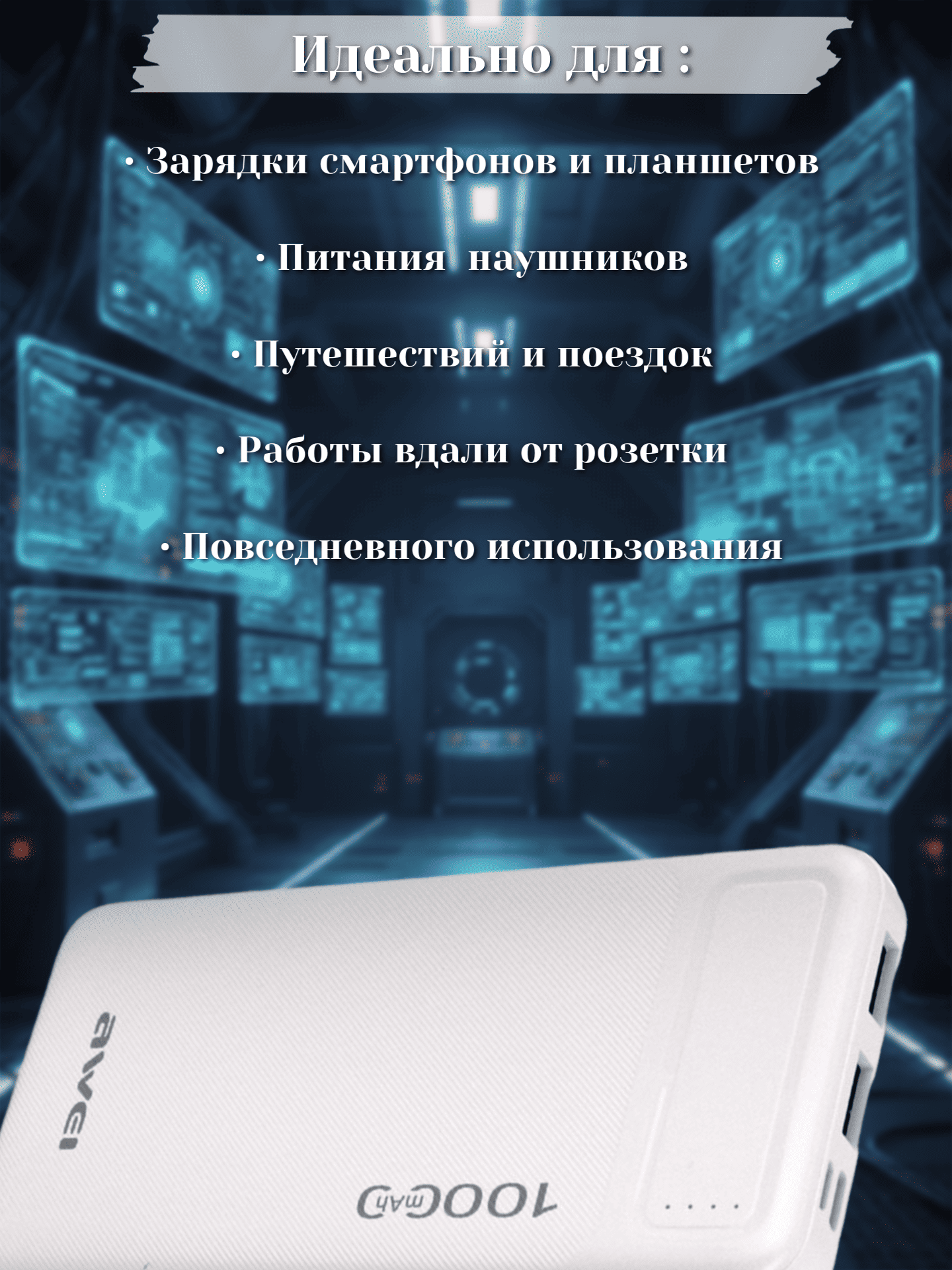 Корпус выполнен из качественного пластика, обеспечивающего прочность и приятные тактильные ощущения. Белый цвет придаёт устройству элегантный и современный вид. Габариты составляют 14,2 × 7,5 см при толщине около 1 см, а вес — всего 203 г. Благодаря компактным размерам повербанк легко помещается в карман или небольшую сумку, всегда оставаясь под рукой, когда нужна дополнительная энергия.