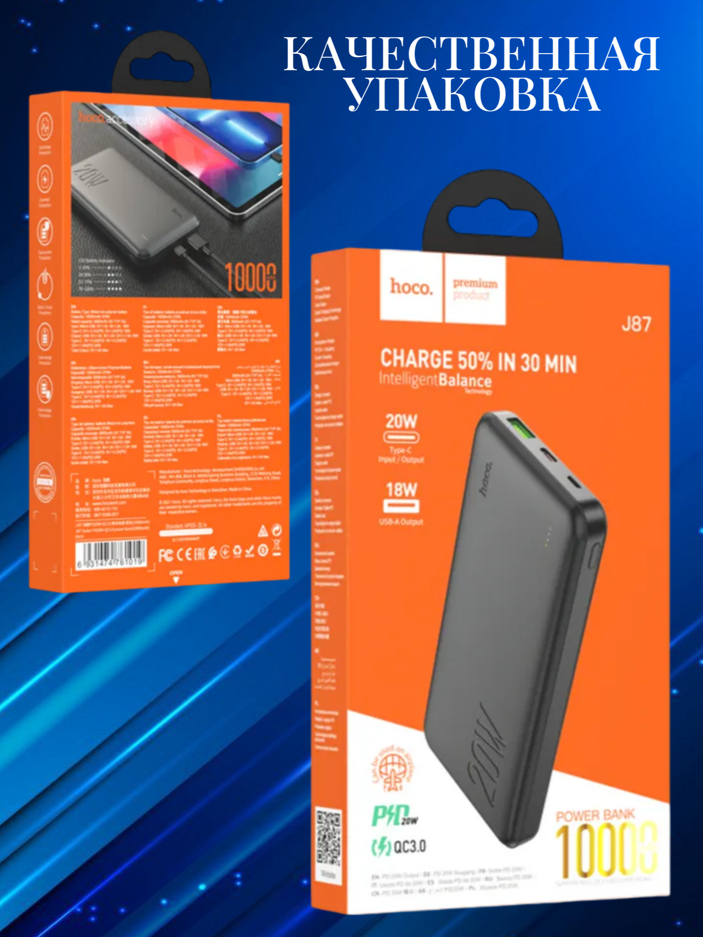 Внешний аккумулятор Hoco J87 — компактное и мощное портативное решение для зарядки смартфонов, наушников, смарт‑часов и других мобильных устройств в любых условиях. Чёрный корпус придаёт модели лаконичный, универсальный вид, а продуманная эргономика делает её удобной в повседневном использовании.