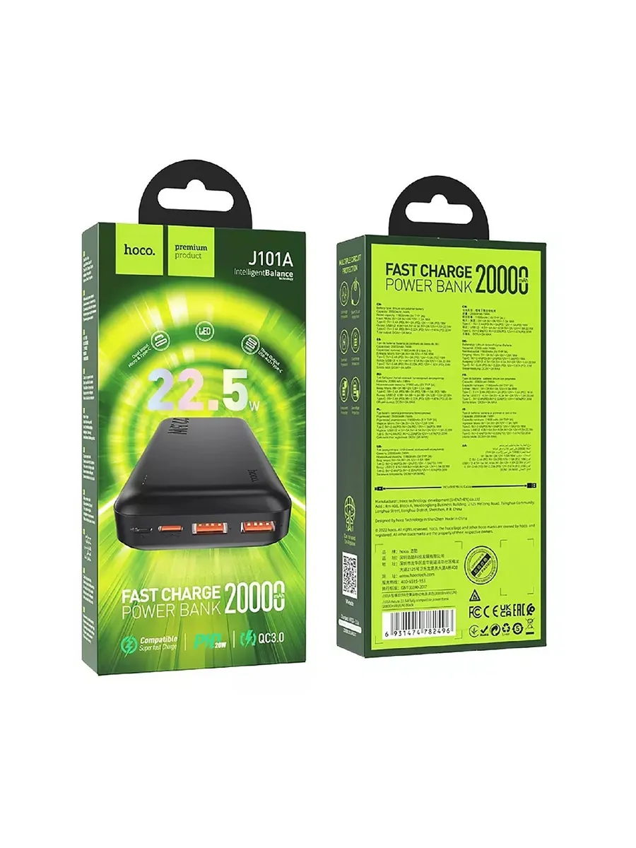 Внешний аккумулятор Hoco J101A ёмкостью 20 000 мА·ч — компактное и функциональное устройство для зарядки мобильных гаджетов в любых условиях. Чёрный корпус из прочного ABS‑пластика выглядит стильно и современно, а эргономичная форма делает аккумулятор удобным для переноски: при внушительной ёмкости он весит всего 462 г и имеет компактные габариты.