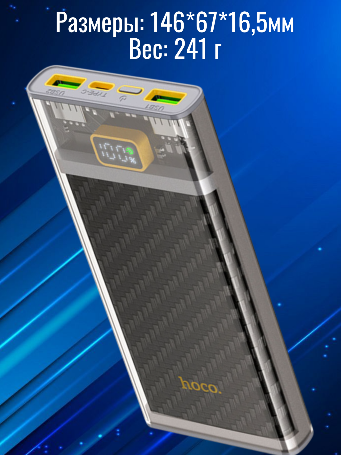 Цифровой LED-дисплей отображает текущий уровень заряда, позволяя всегда быть в курсе оставшейся ёмкости. Компактные размеры 146×67×16.5 мм и вес 241 грамм делают устройство удобным для переноски в кармане или сумке.