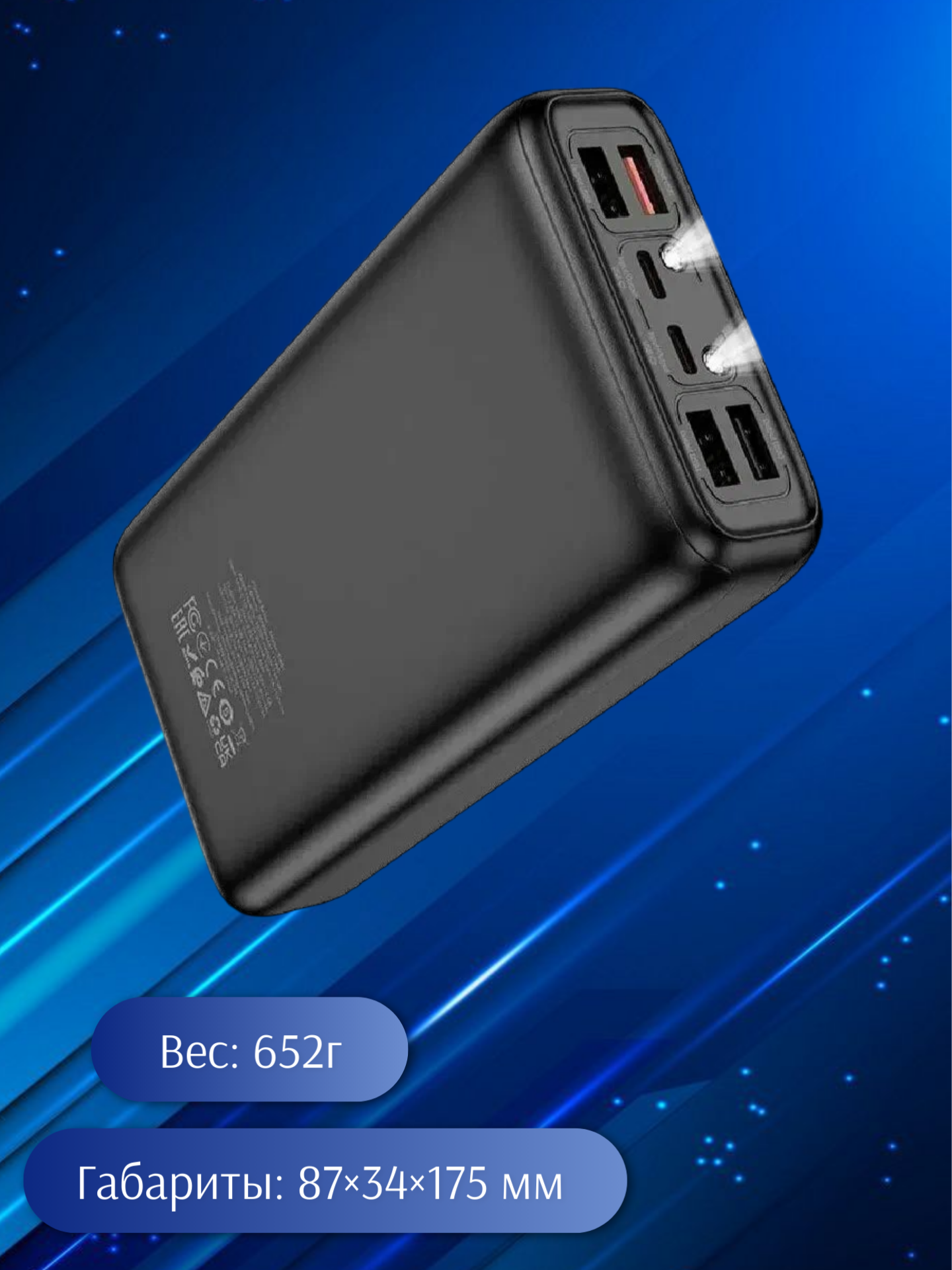 Корпус изготовлен из огнестойких материалов — АБС‑пластика и поликарбоната, что гарантирует безопасность при длительной эксплуатации. Литий‑полимерный аккумулятор (Li‑Pol) обеспечивает высокую плотность энергии при относительно небольшом весе. Общие габариты устройства — 87 × 34 × 175,4 мм, масса — 652 г: повербанк легко помещается в сумку или рюкзак.