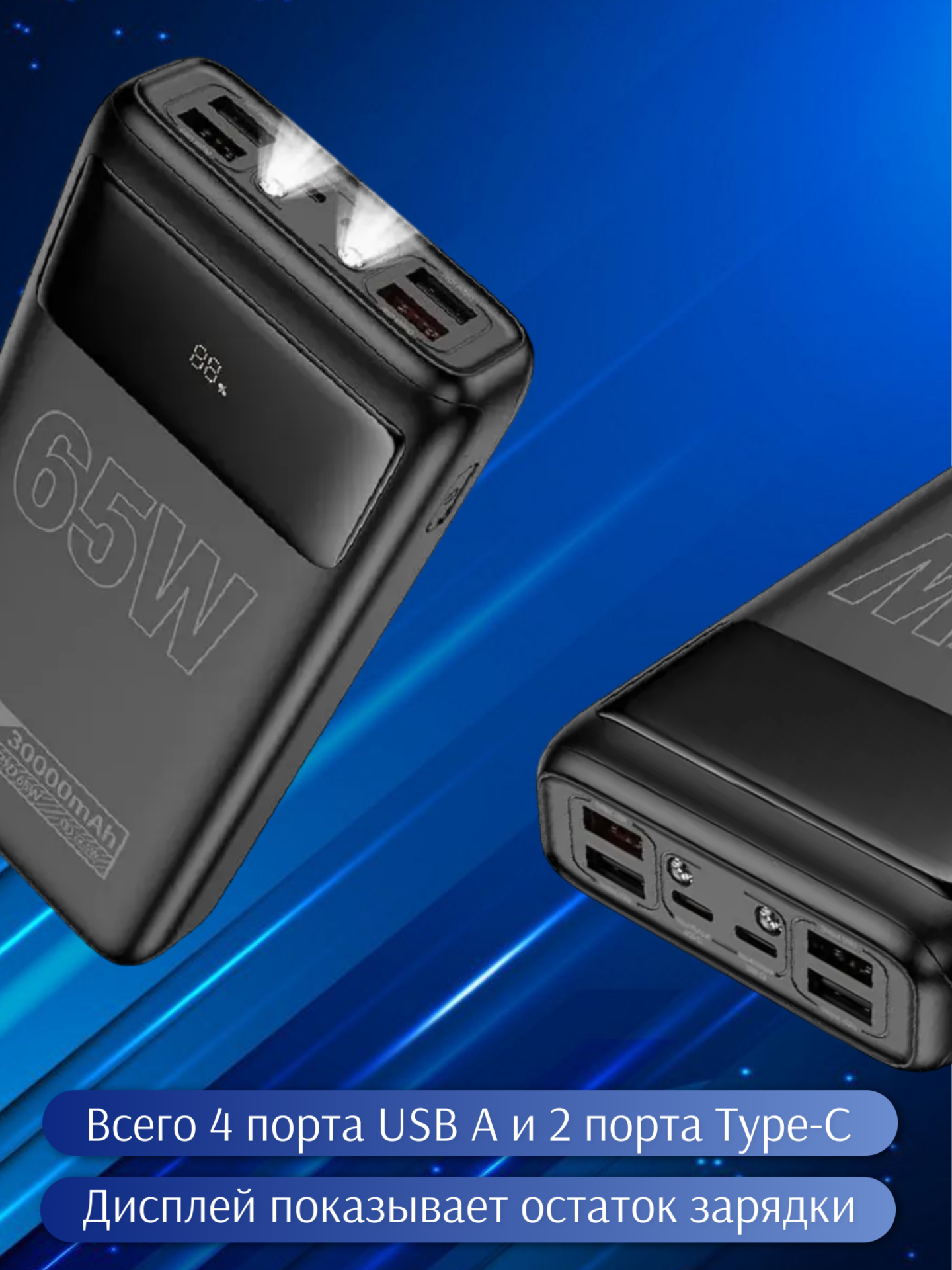 Ключевое преимущество модели — высокая выходная мощность. Через разъёмы USB Type‑C можно выдавать до 65 Вт (с поддержкой протоколов PD, PPS, QC, FCP и AFC), что позволяет заряжать даже ноутбуки. Порт USB A обеспечивает до 22,5 Вт (совместим с QC, FCP, SCP и AFC). Всего предусмотрено 4 порта USB A и 2 порта Type‑C, благодаря чему можно одновременно подпитывать несколько устройств.