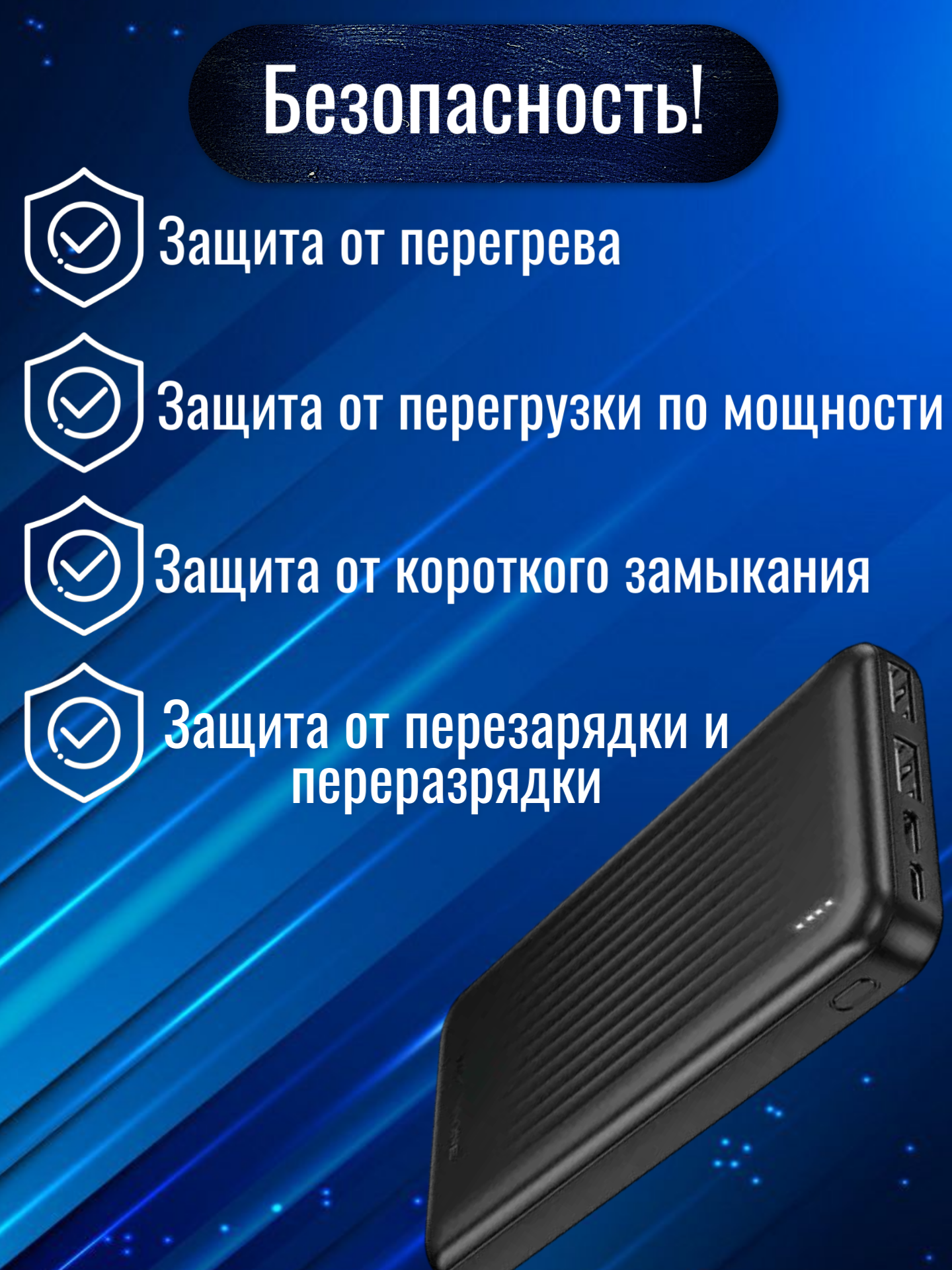 Устройство оснащено разнообразными интерфейсами подключения: двумя выходными портами USB‑A и входными разъёмами USB‑C и Micro‑USB. Такая комплектация позволяет одновременно заряжать два гаджета через USB‑A (каждый с выходным током 5 В / 2 А), а также использовать разные типы кабелей для подзарядки самого аккумулятора. Общий выходной ток составляет 5 В / 2 А, что обеспечивает стабильную подачу энергии без перегрузки сети.