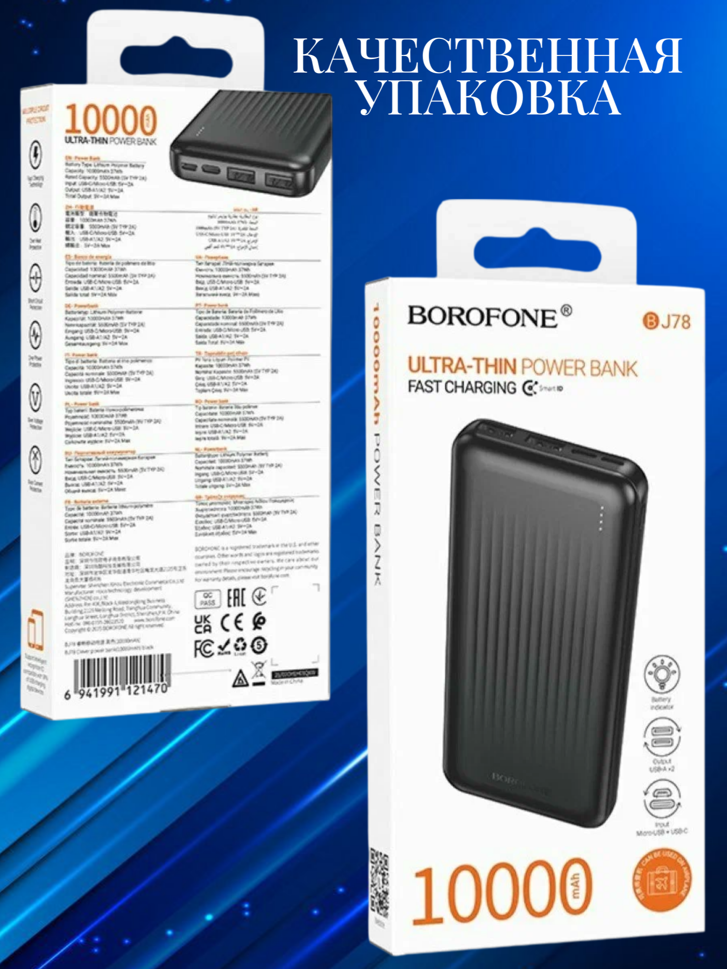 Borofone BJ78 — это сбалансированное решение для тех, кто ищет надёжный, компактный и многофункциональный внешний аккумулятор. Сочетание вместительности, универсальных разъёмов и продуманной эргономики делает его практичным спутником в повседневной жизни и поездках.