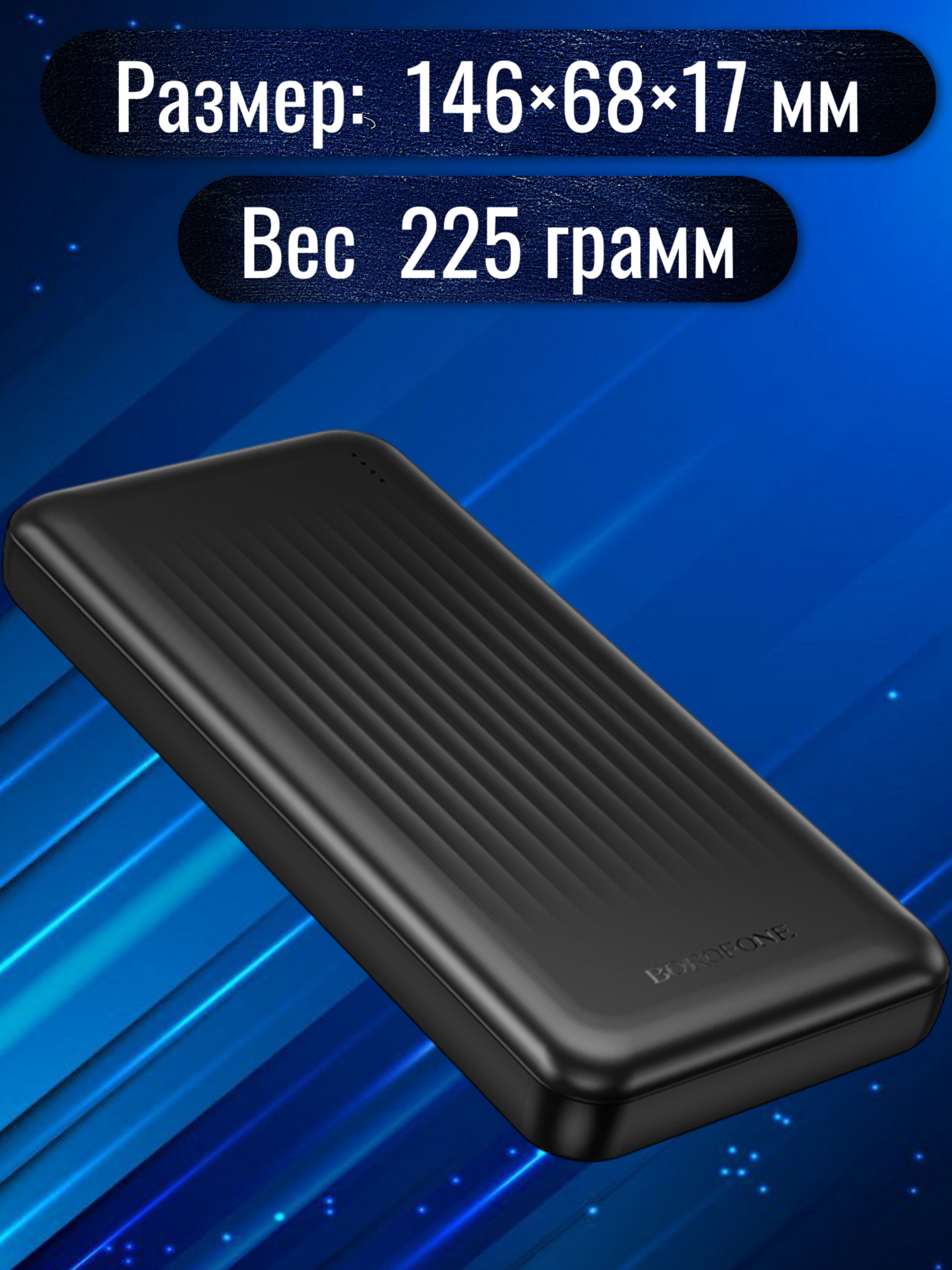 Внешний аккумулятор Borofone BJ78 ёмкостью 10 000 мА·ч (37 Вт·ч) в чёрном исполнении — это компактное и функциональное устройство для подзарядки мобильных гаджетов в дороге, на работе или в путешествии. Несмотря на внушительный запас энергии, аккумулятор отличается скромными габаритами (146 × 68 × 17 мм) и небольшим весом (225 г), что делает его удобным для постоянного ношения в сумке или кармане.