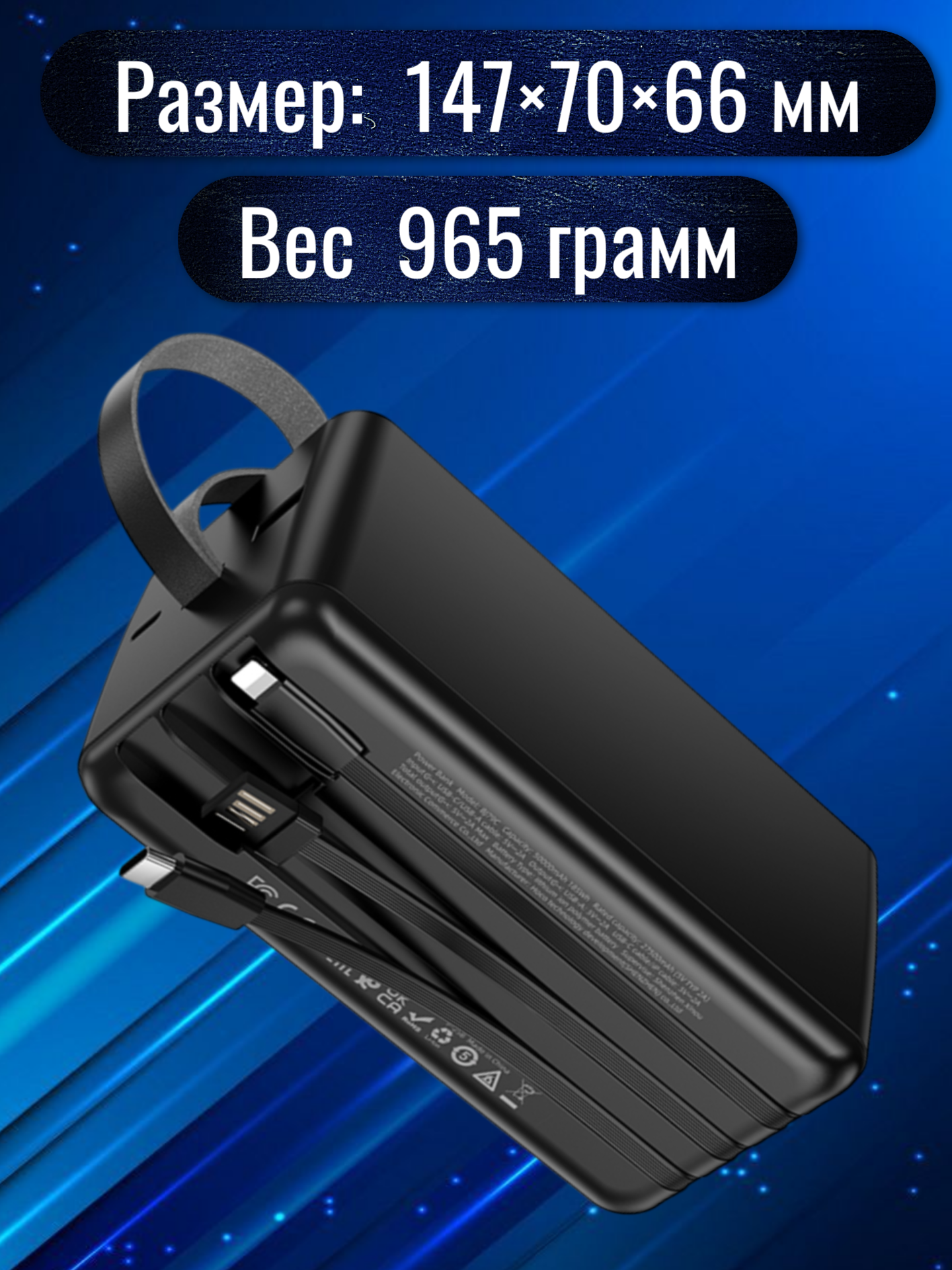 Устройство оснащено несколькими встроенными кабелями (USB‑C, Lightning и USB‑A), что делает его совместимым с широким спектром гаджетов без необходимости брать с собой дополнительные шнуры. Также имеется отдельный стандартный USB‑порт для подключения собственных кабелей.
