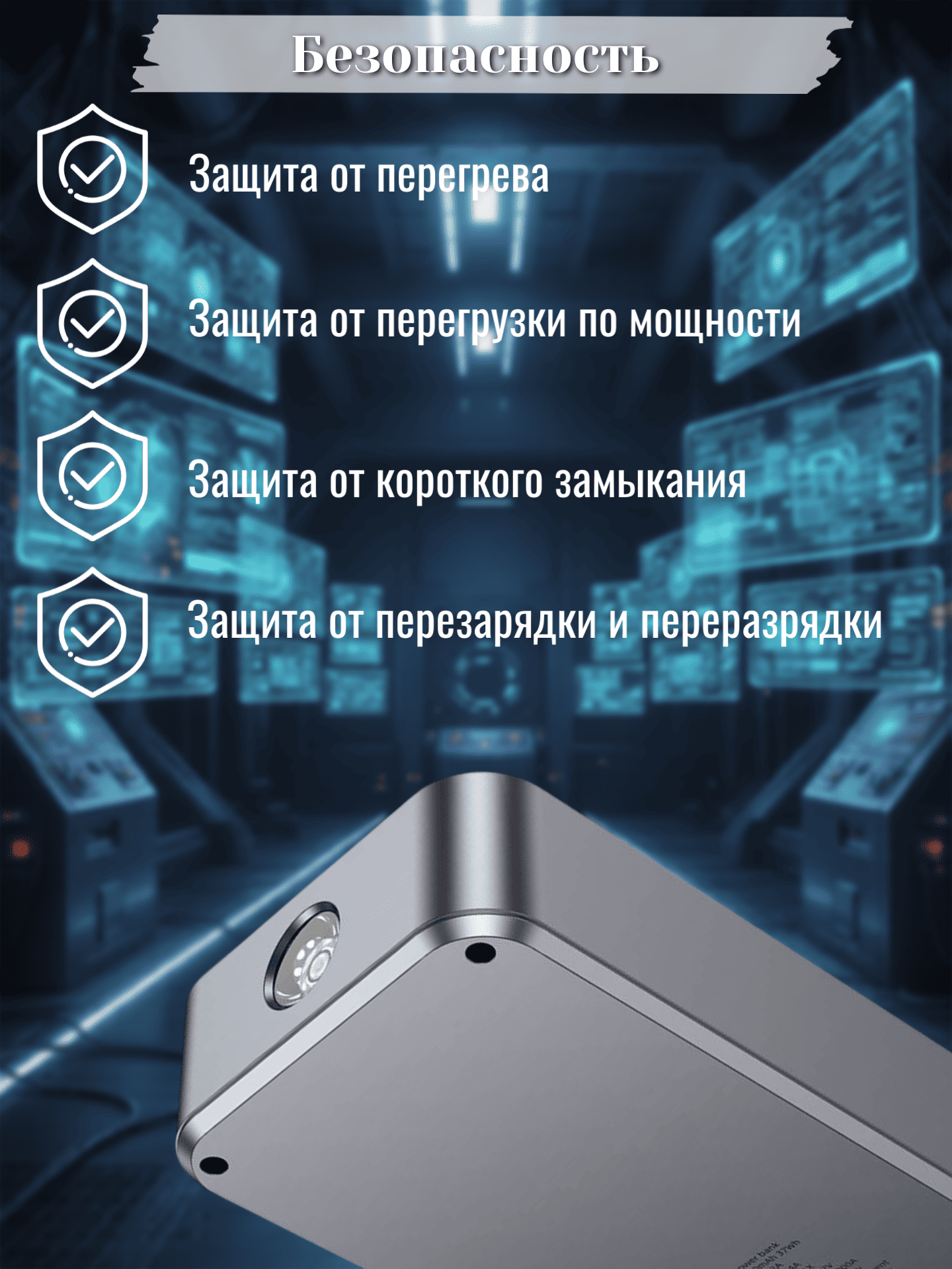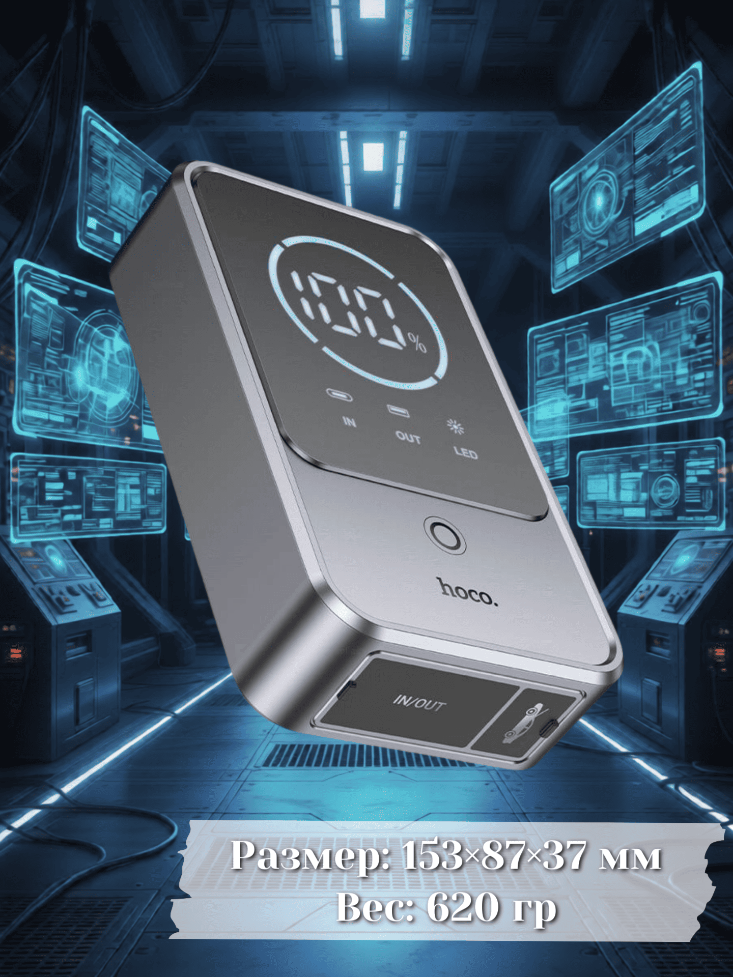 Корпус выполнен из огнеупорных материалов ABS + PC, обеспечивающих прочность и безопасность. Внутри установлена высокопроизводительная литий‑полимерная батарея. Компактные габариты — 153×87×37 мм, а общий вес (с зажимами) составляет 620 г, что позволяет легко хранить устройство в багажнике или бардачке.