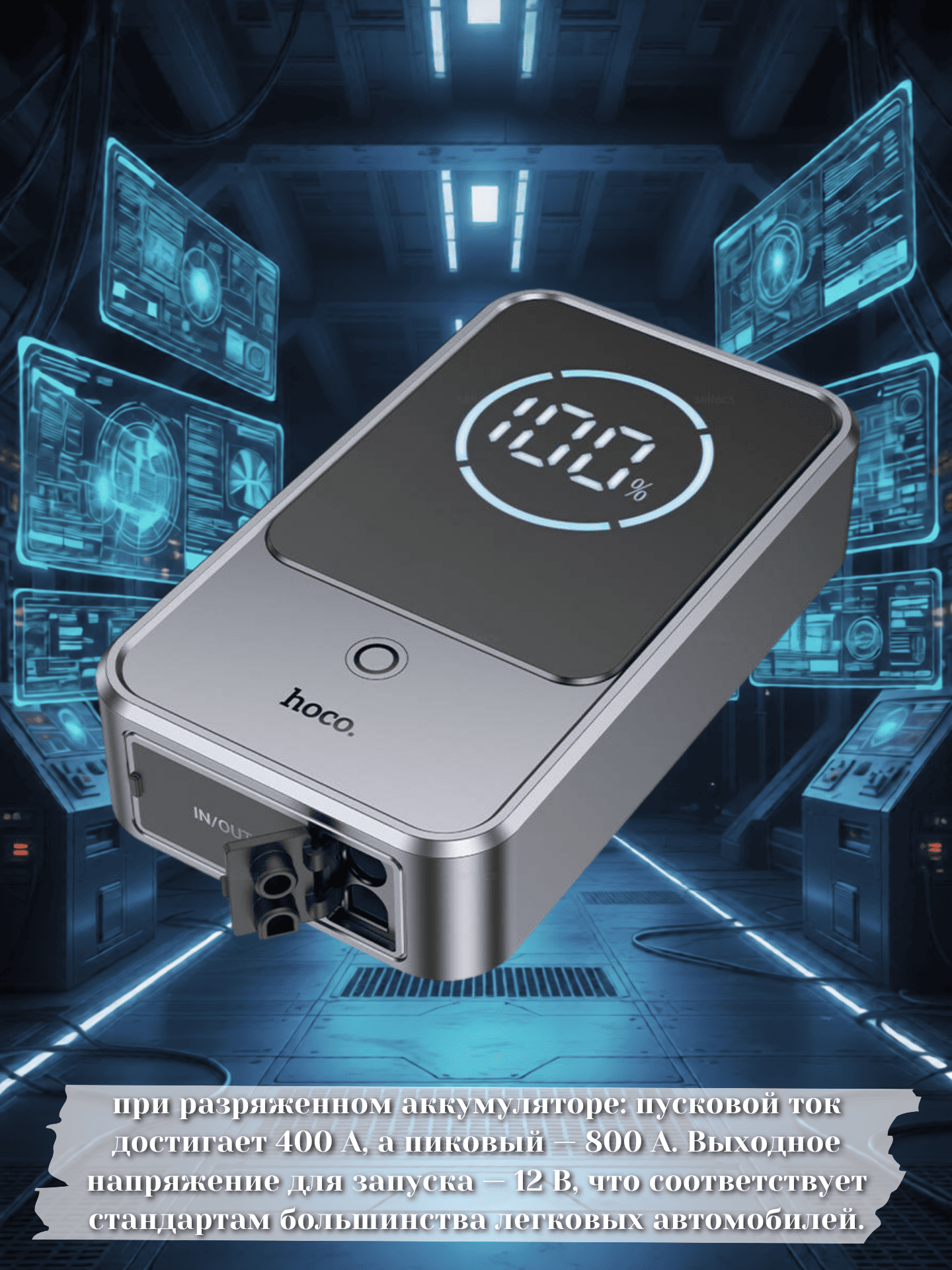 Устройство способно экстренно запустить бензиновый или дизельный автомобиль при разряженном аккумуляторе: пусковой ток достигает 400 А, а пиковый — 800 А. Выходное напряжение для запуска — 12 В, что соответствует стандартам большинства легковых автомобилей.