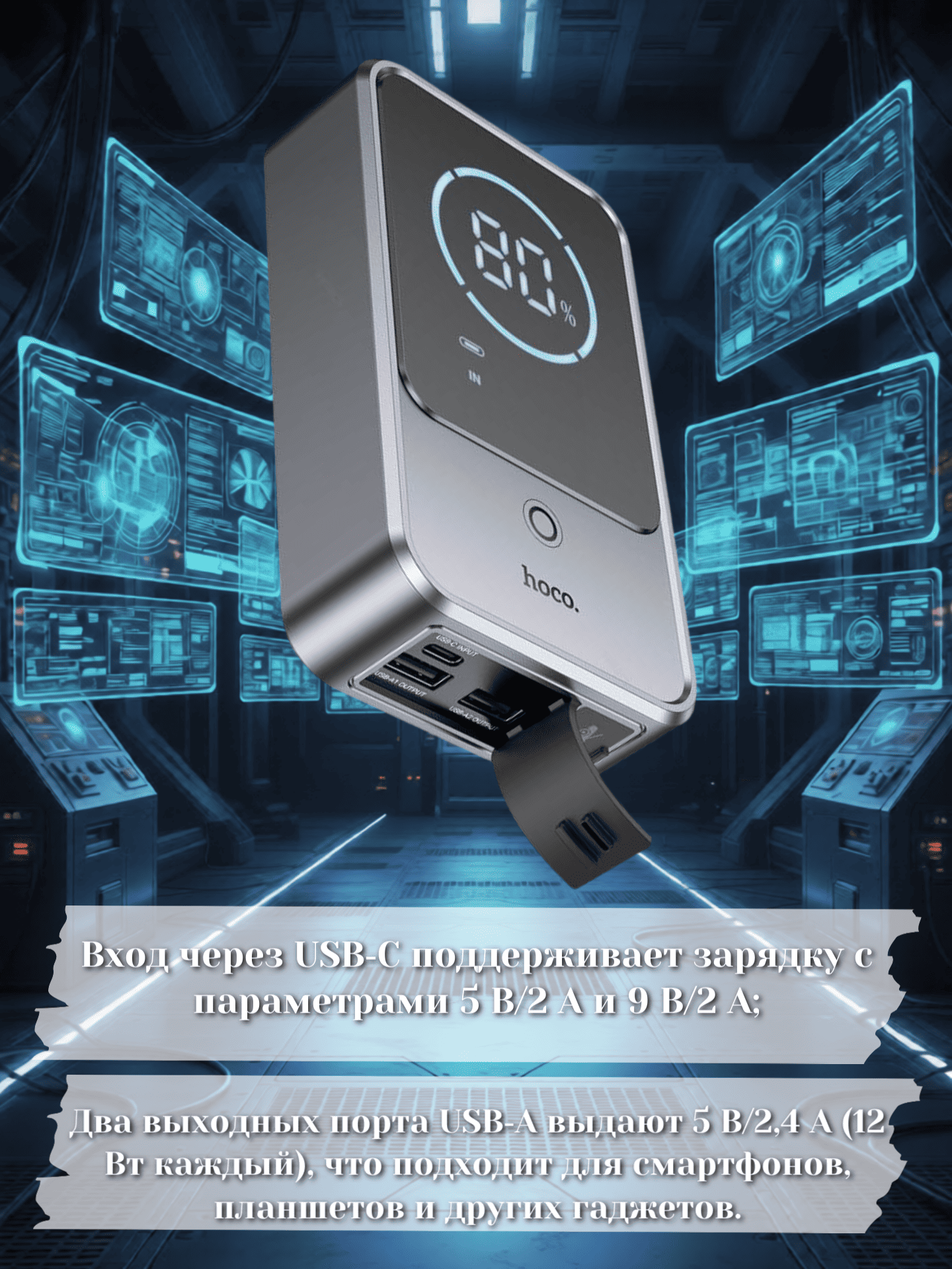 два выходных порта USB‑A выдают 5 В/2,4 А (12 Вт каждый), что подходит для смартфонов, планшетов и других гаджетов.