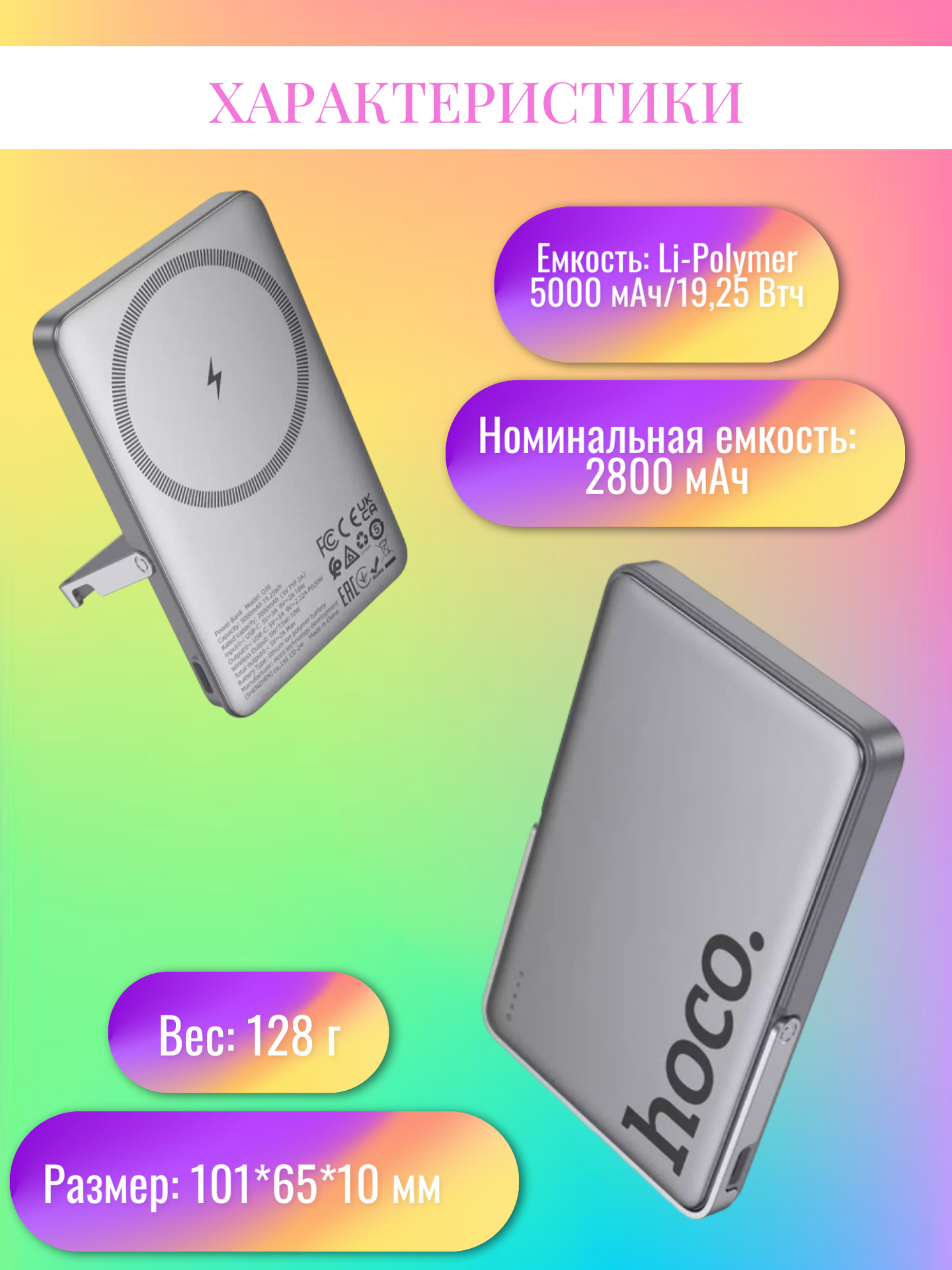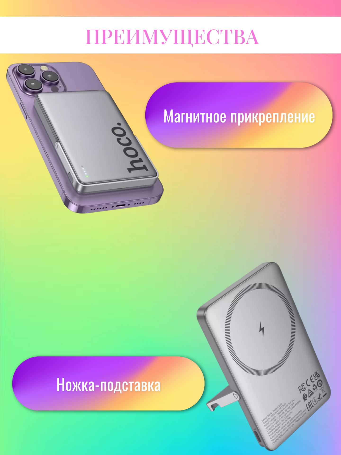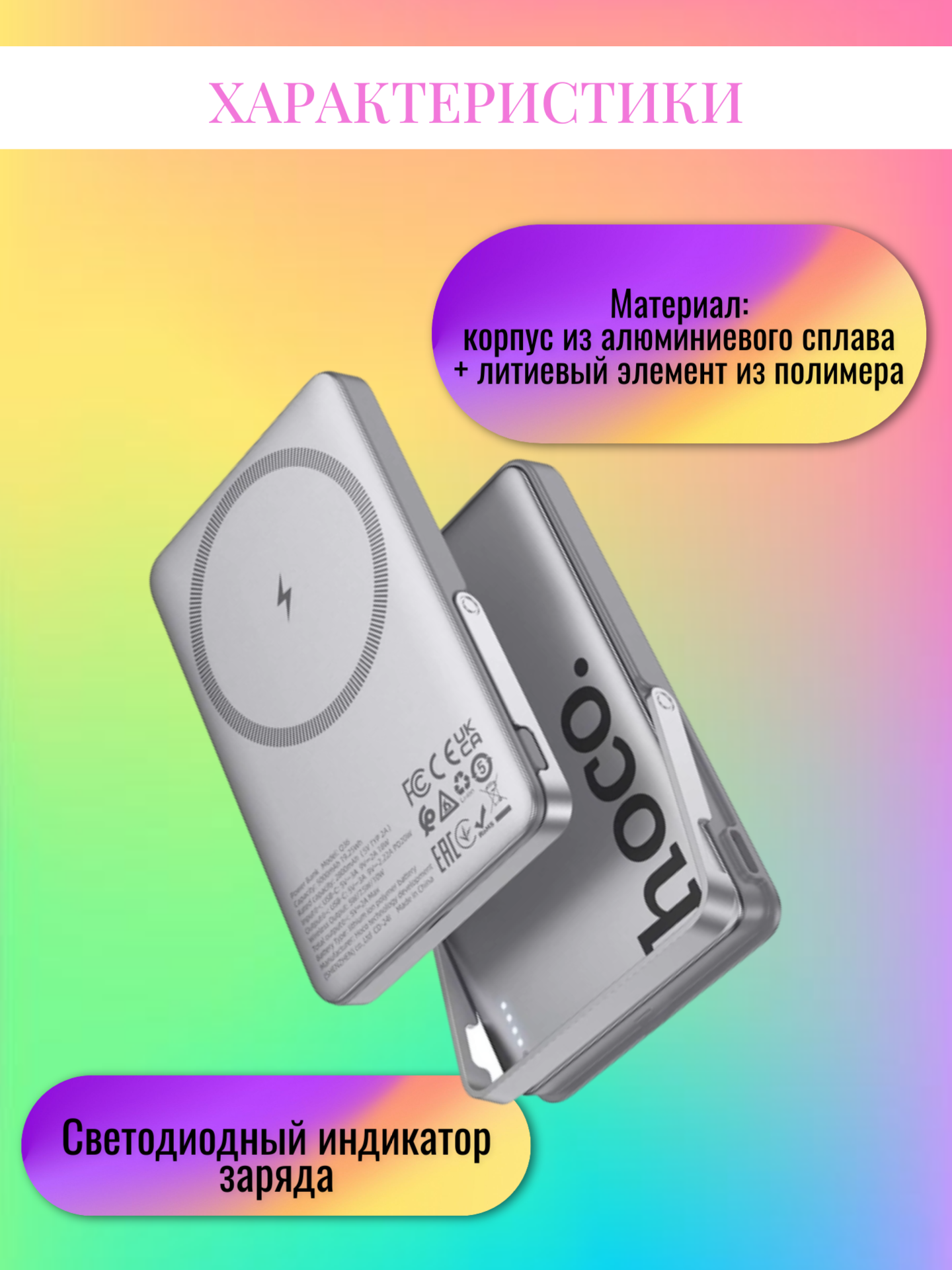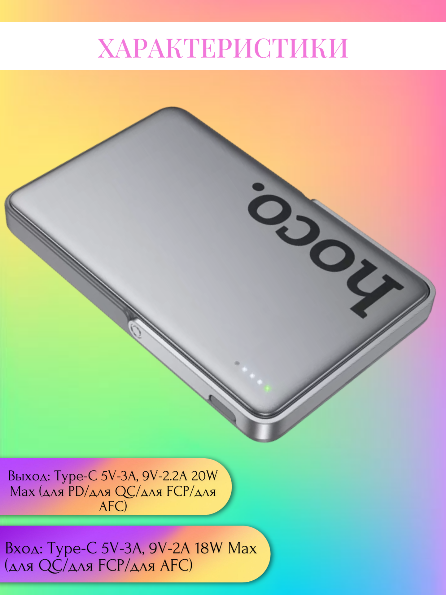 Основные характеристики включают ёмкость 5000 мАч, поддержку быстрой проводной зарядки мощностью до 20 Вт через порт Type-C и беспроводную зарядку мощностью до 10 Вт. Устройство автоматически определяет оптимальную мощность зарядки для вашего гаджета.