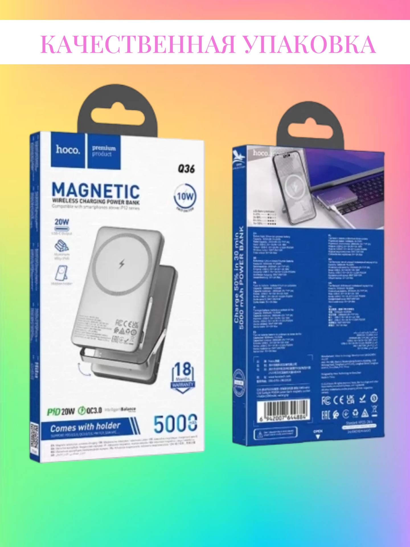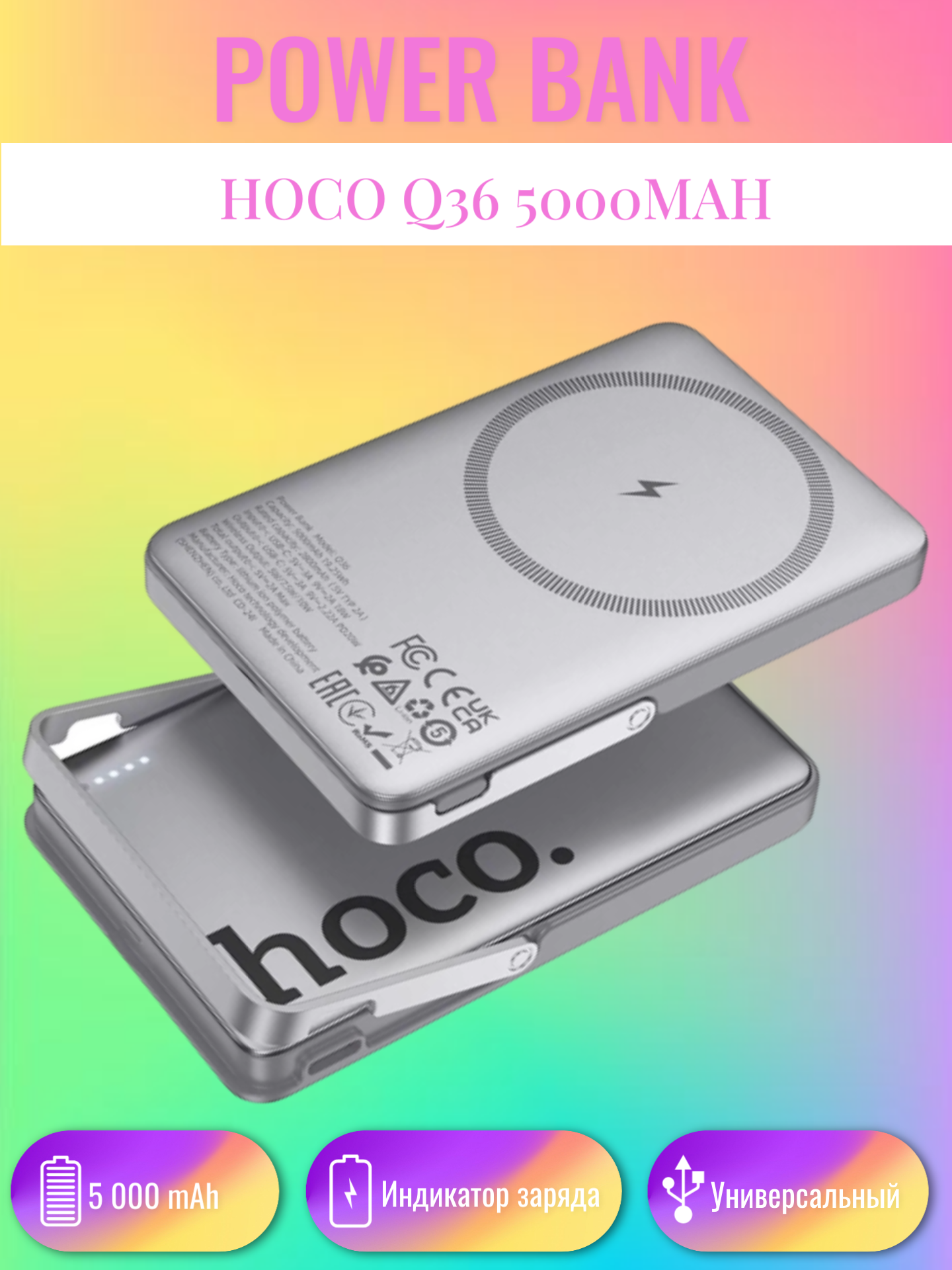 Hoco Q36 совместим с широким спектром устройств, включая смартфоны Apple iPhone (включая модели с поддержкой MagSafe), устройства на Android, а также беспроводные наушники и смарт-часы. Встроенный LED-индикатор позволяет отслеживать уровень заряда аккумулятора.