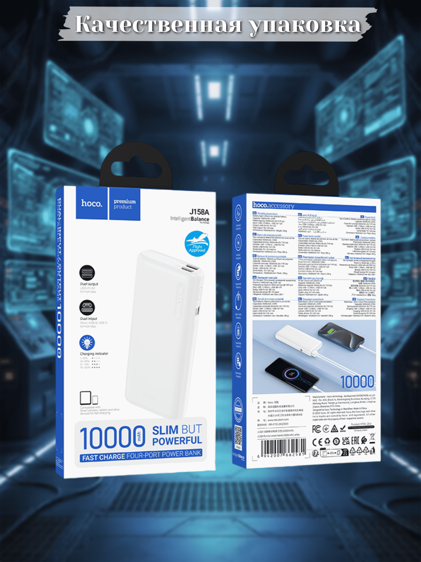 Габариты устройства — 142×64×23 мм, вес — 290 г. Благодаря умеренным размерам и массе аккумулятор удобно помещается в карман, сумку или отделение рюкзака, всегда оставаясь под рукой. HOCO J158A станет практичным источником питания для разнообразных мобильных гаджетов в повседневной жизни и в поездках.