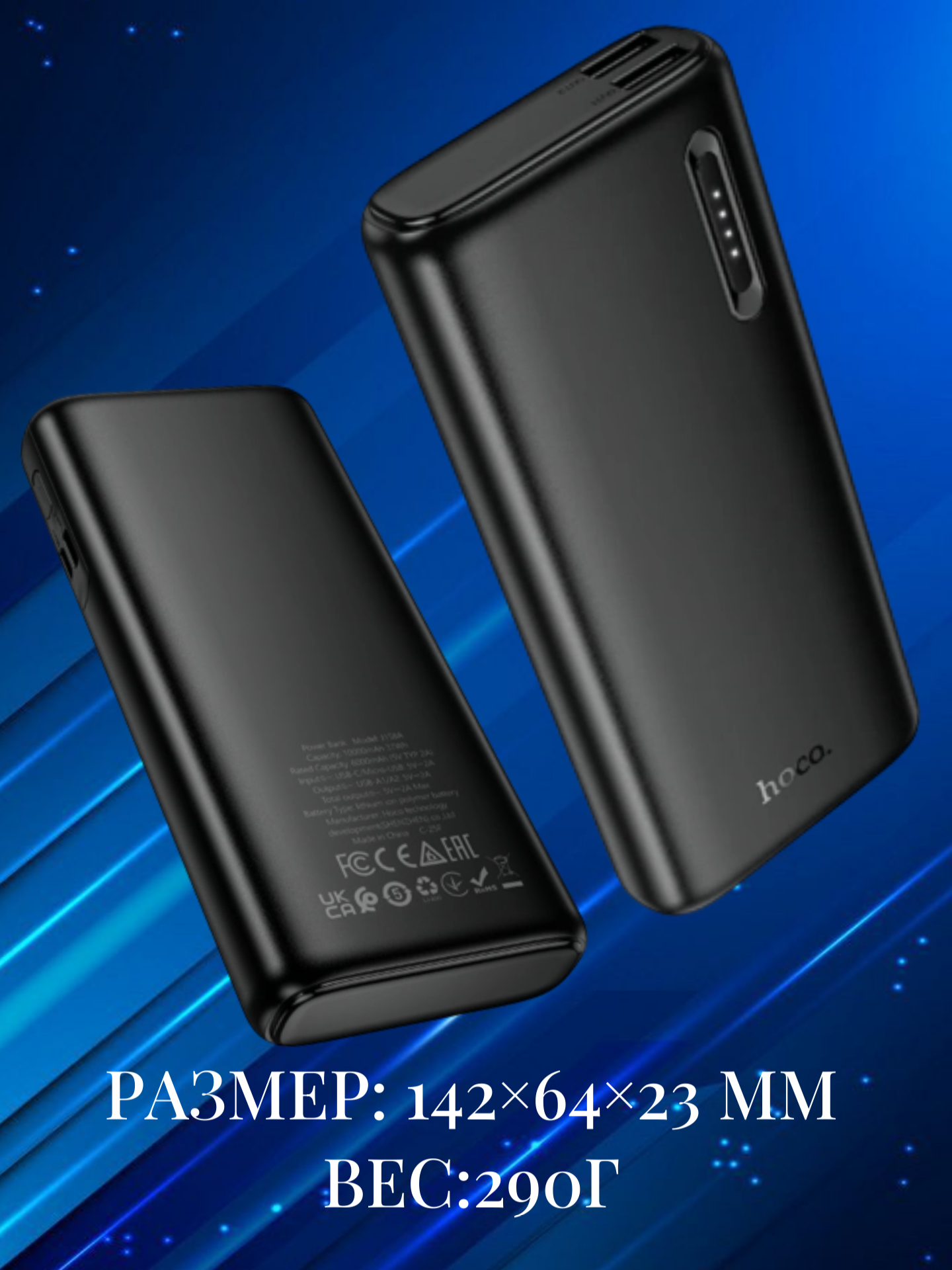Габариты устройства — 142×64×23 мм, вес — 290 г. Благодаря умеренным размерам и массе аккумулятор удобно помещается в карман, сумку или отделение рюкзака, всегда оставаясь под рукой. HOCO J158A станет практичным источником питания для разнообразных мобильных гаджетов в повседневной жизни и в поездках.