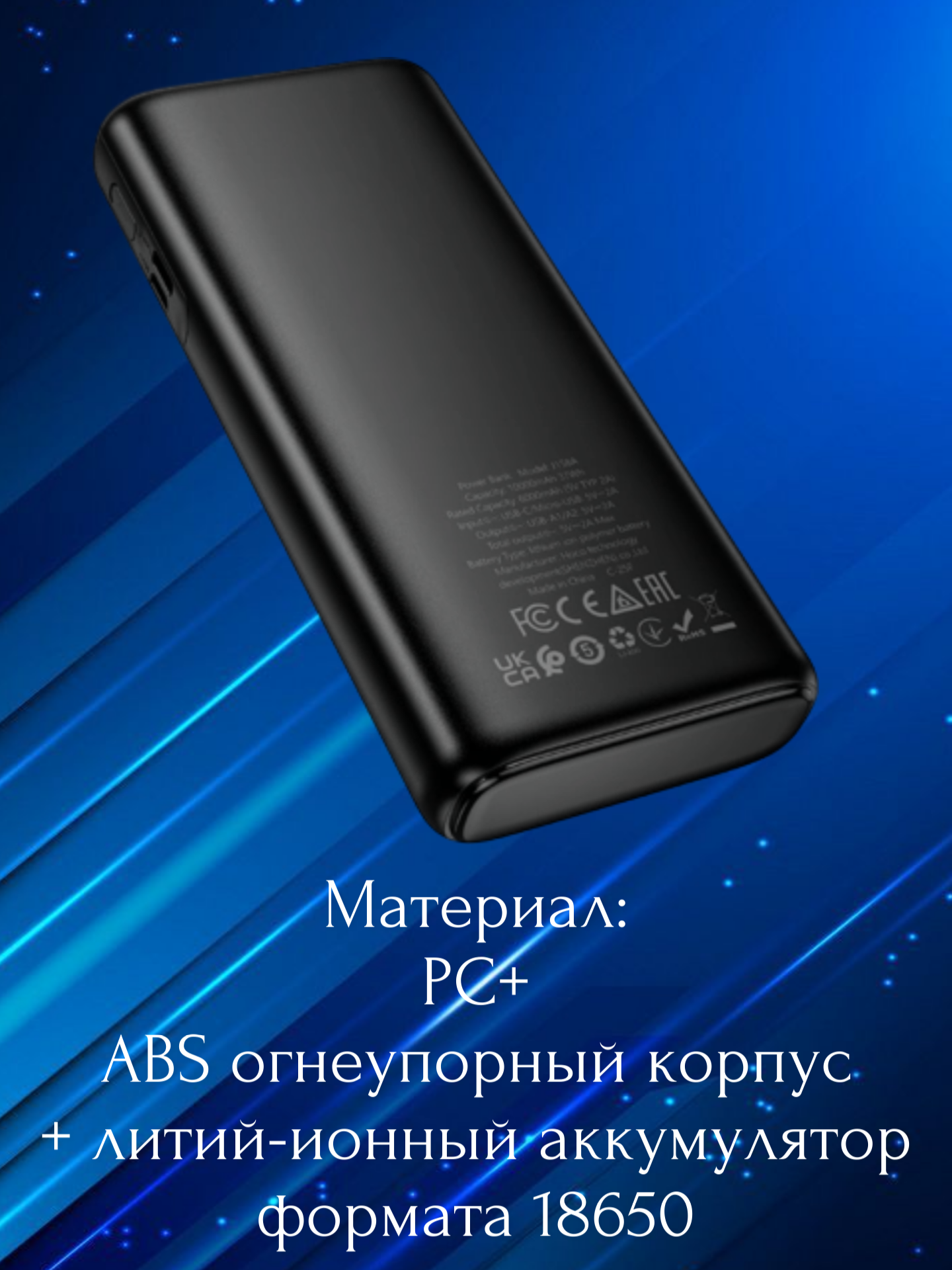 Корпус изготовлен из качественных и безопасных материалов — комбинации огнестойкого PC и ABS‑пластика, что обеспечивает надёжность и долговечность конструкции. Внутри установлена литиевая батарея формата 18650, отличающаяся стабильностью работы и устойчивостью к внешним воздействиям.