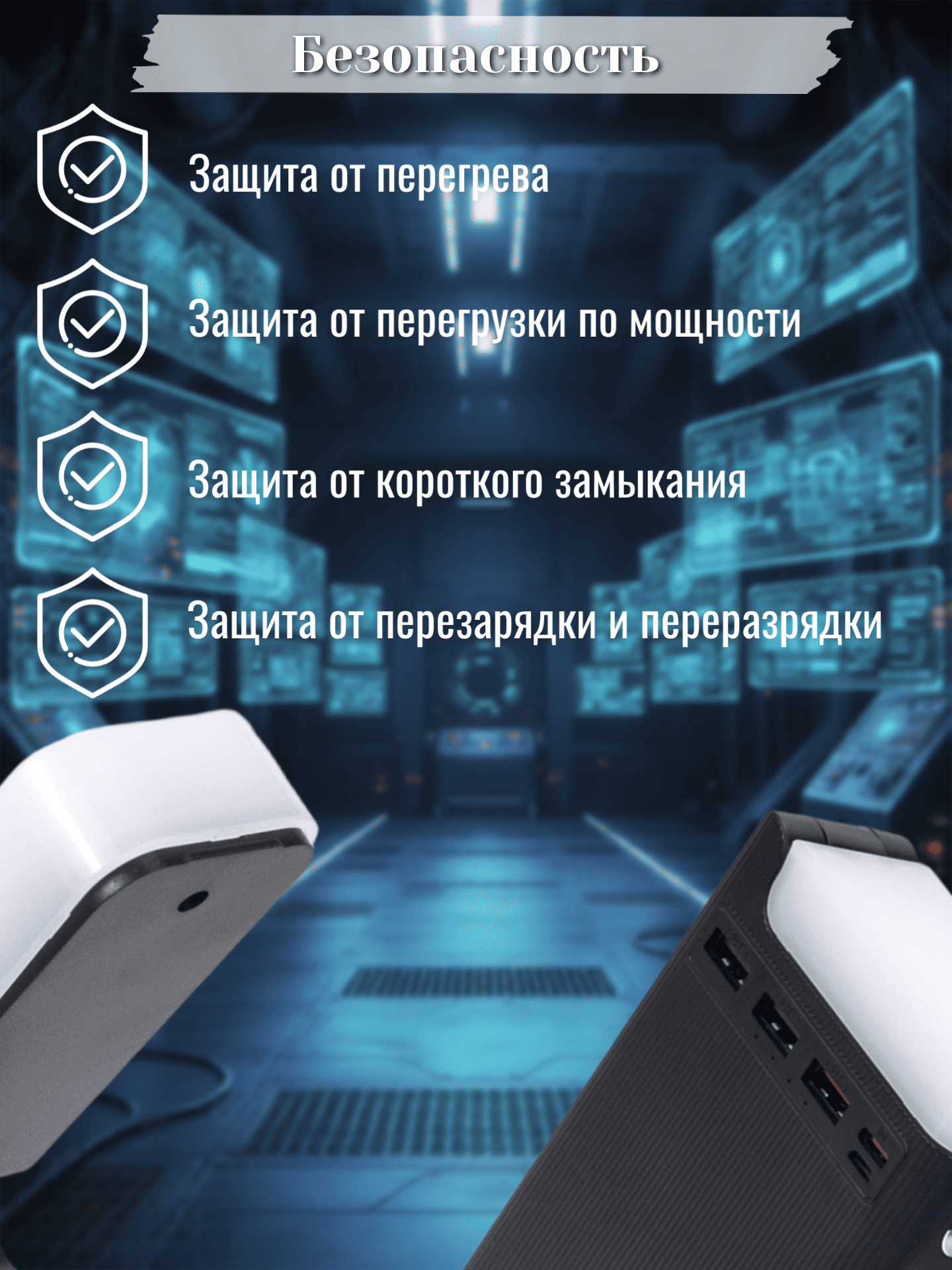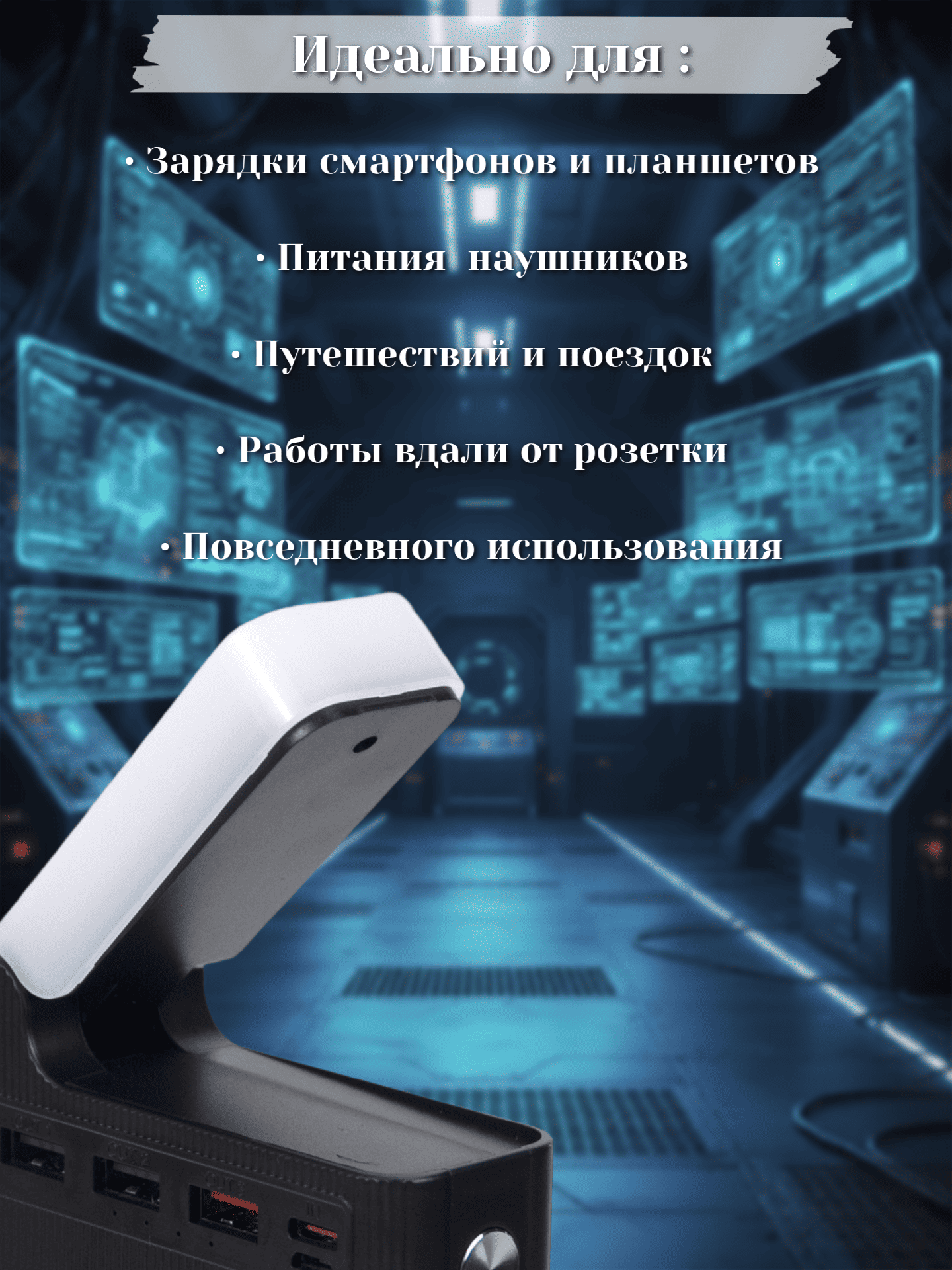 В основе устройства лежит литий-полимерный (Li-Pol) аккумулятор, сочетающий высокую энергоёмкость с компактными габаритами (168 × 83 × 33 мм). Модель оснащена несколькими портами для одновременной зарядки сразу нескольких девайсов: три USB-выхода (USB1, USB2, USB3) и разъём Type-C. Каждый из портов поддерживает разную мощность выходного тока, что позволяет оптимально заряжать устройства с различными требованиями к питанию. Например, через USB1 и USB2 можно выдавать ток до 5 В / 3 А, а USB3 поддерживает расширенный диапазон напряжений (5–12 В) и токов (до 2,25–3 А).