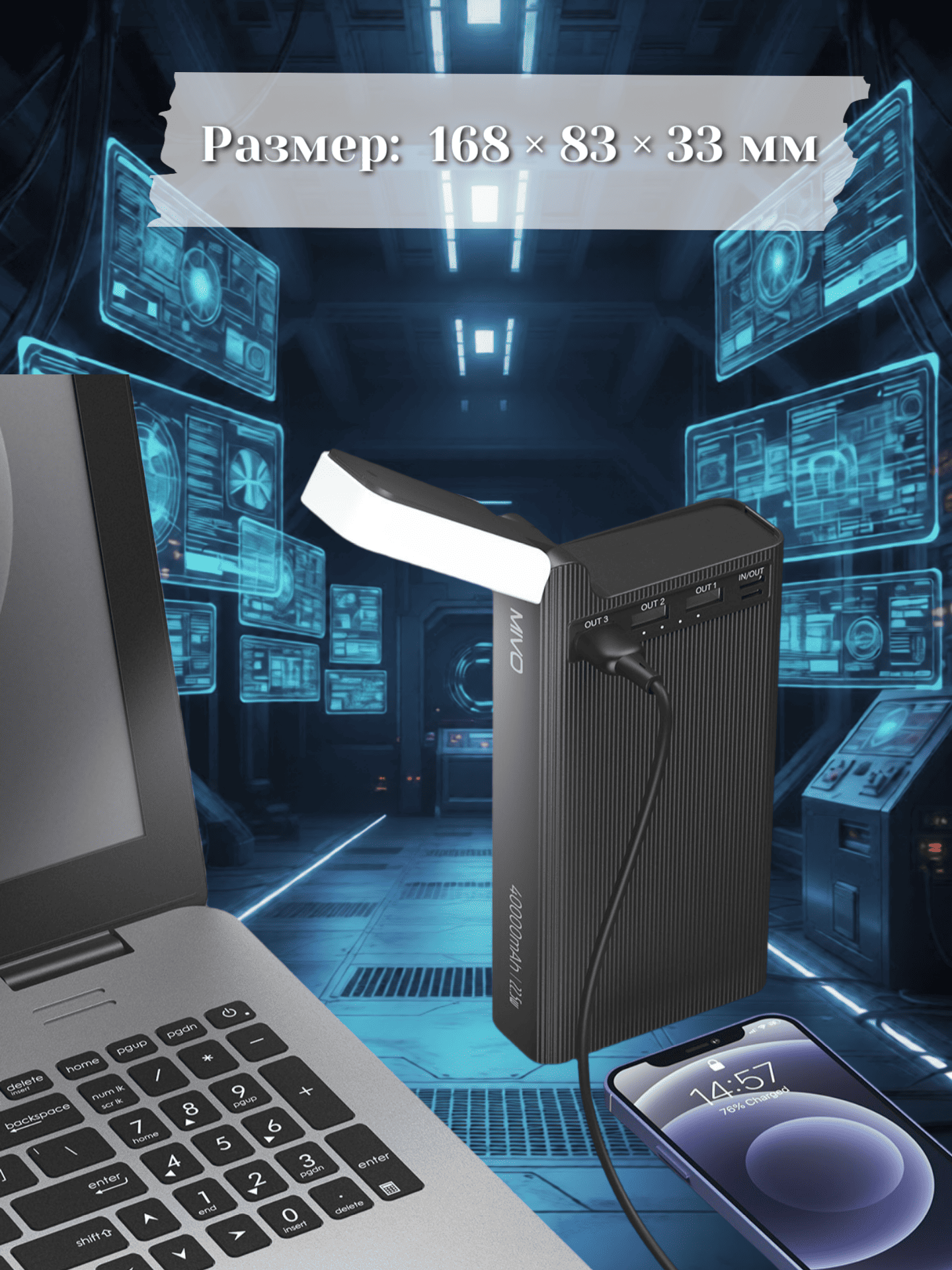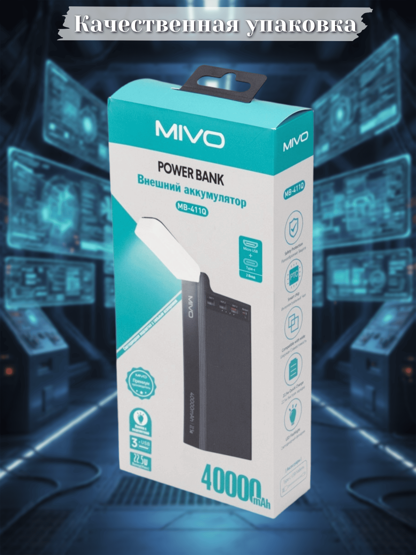 Повербанк MIVO MB-411Q с интегрированным светильником — надёжное и многофункциональное устройство для подзарядки гаджетов в любых условиях. С ёмкостью аккумулятора 40 000 мАч (148 Wh) он способен многократно заряжать смартфоны, планшеты и другие устройства, не беспокоясь о скором исчерпании собственного заряда.