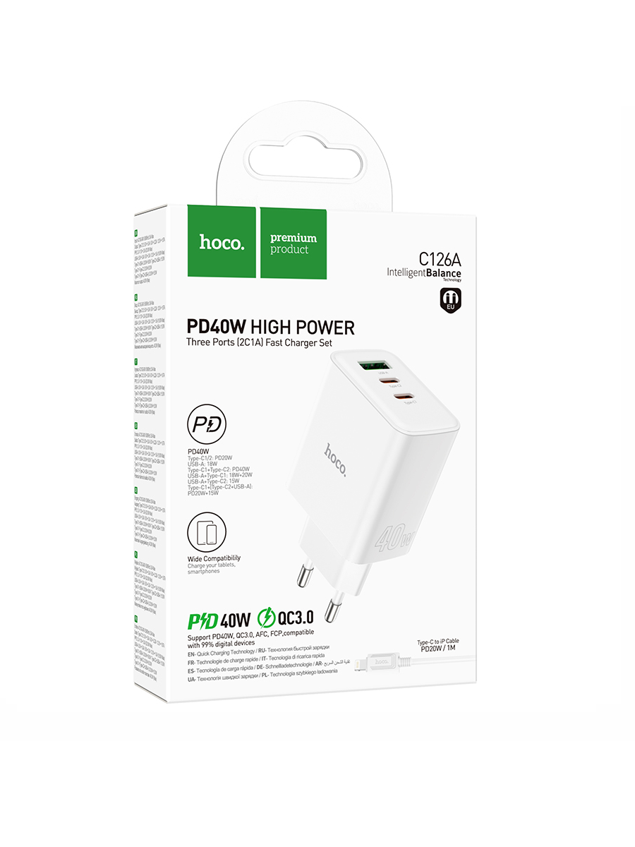 Сетевое зарядное устройство Hoco C126A + кабель Type-C Lightning 1 м, белый