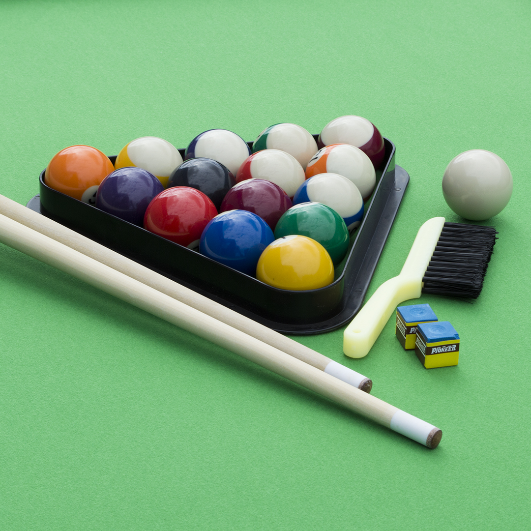 2 кия разборных (145см), набор шаров 50,8 мм (пул), треугольник,  2 мелка, щетка.
