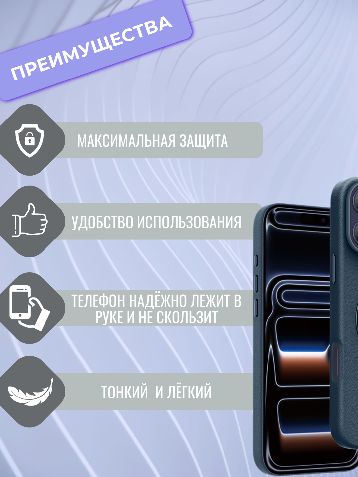 Лаконичный тёмно‑синий цвет и утончённые детали подчёркивают статусность аксессуара, делая его уместным в любом образе — от делового до повседневного. При этом чехол остаётся достаточно компактным и не добавляет лишнего объёма iPhone 17 Pro Max.