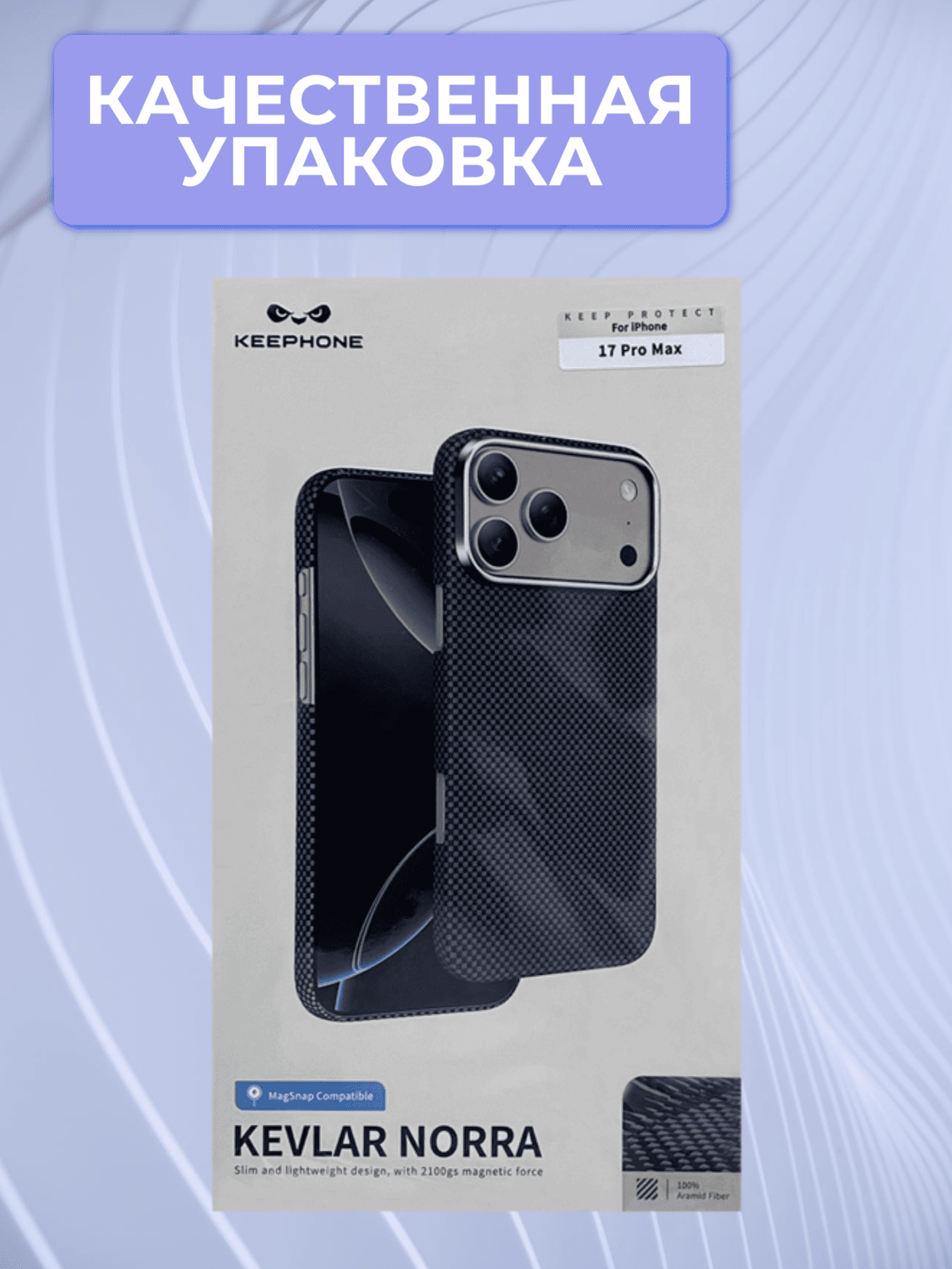 KEEPHONE KEVLAR NORRA объединяет передовые технологии, тактильный комфорт и надёжную защиту — прочный арамид, продуманная эргономика, безупречная интеграция с MagSafe и лаконичный стиль делают этот чехол практичным и стильным выбором для владельцев iPhone 17 Pro Max.