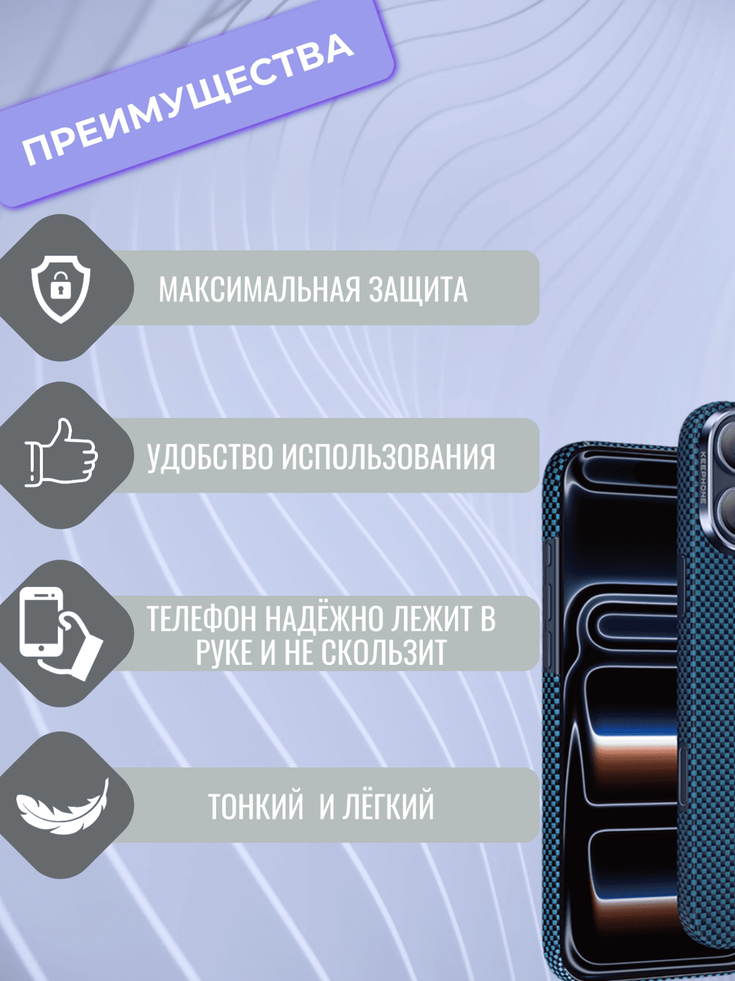 При всей своей прочности чехол остаётся предельно лёгким и тонким: он не утяжеляет устройство и не нарушает его эргономику, подчёркивая лаконичный облик iPhone и сохраняя ощущение премиального гаджета в руках. Особая 3D‑тканевая текстура поверхности не только создаёт визуально привлекательный узор, но и выполняет практическую функцию — фактура обеспечивает уверенный и комфортный хват, предотвращая выскальзывание смартфона даже из влажных рук.