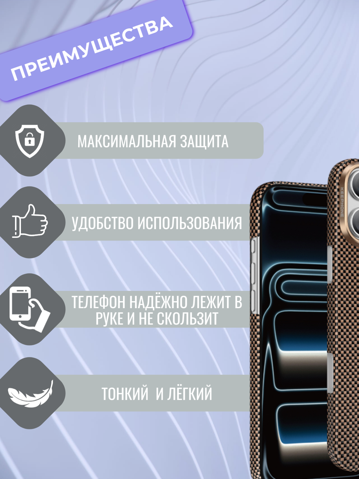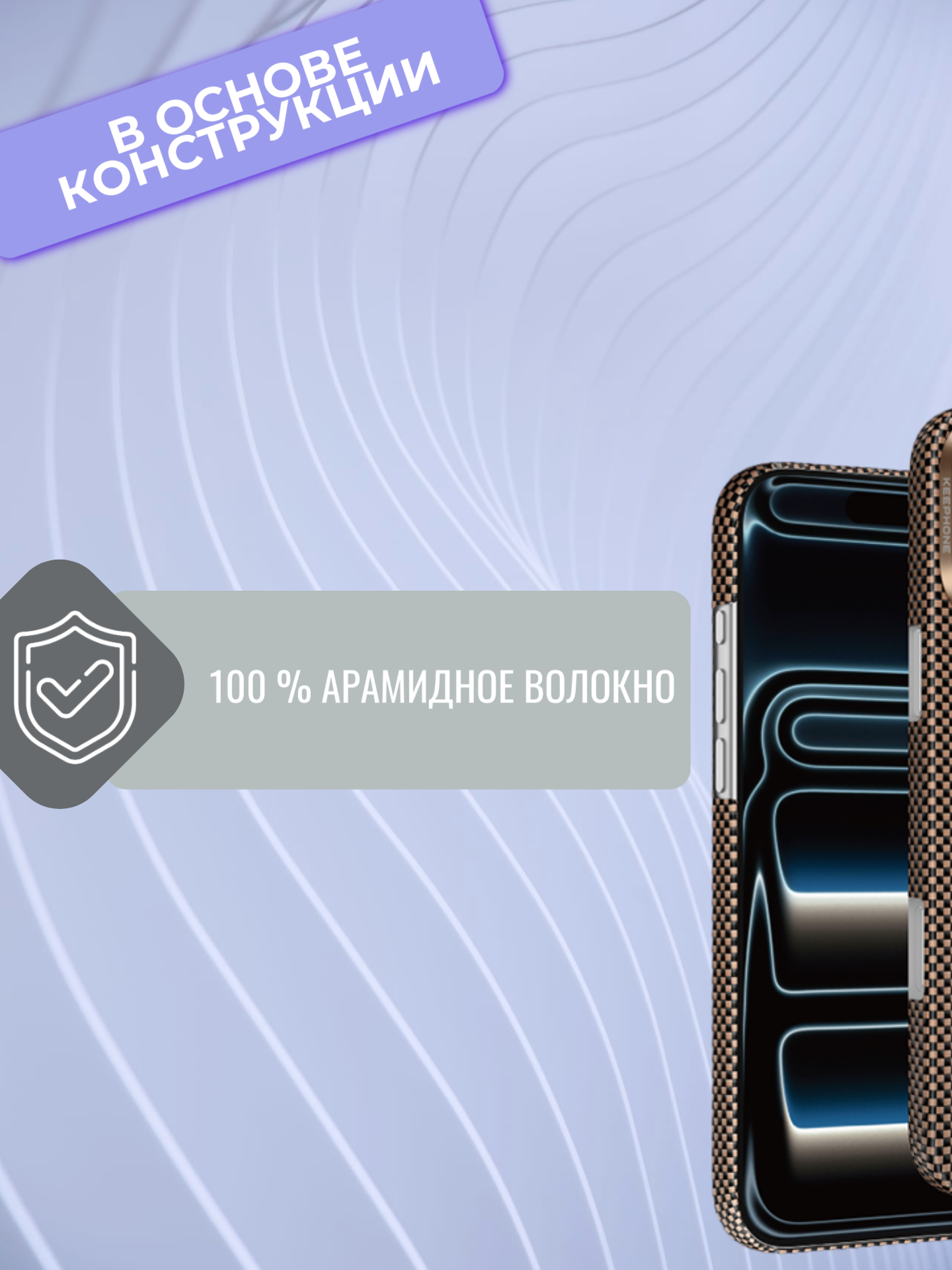 Уровень защиты соответствует военным стандартам: конструкция эффективно амортизирует удары и поглощает энергию при падениях, минимизируя риск повреждений корпуса и внутренних компонентов. Арамидное волокно берёт на себя основную нагрузку, сохраняя iPhone в целости даже в сложных условиях эксплуатации — будь то повседневная суета города или активный отдых.