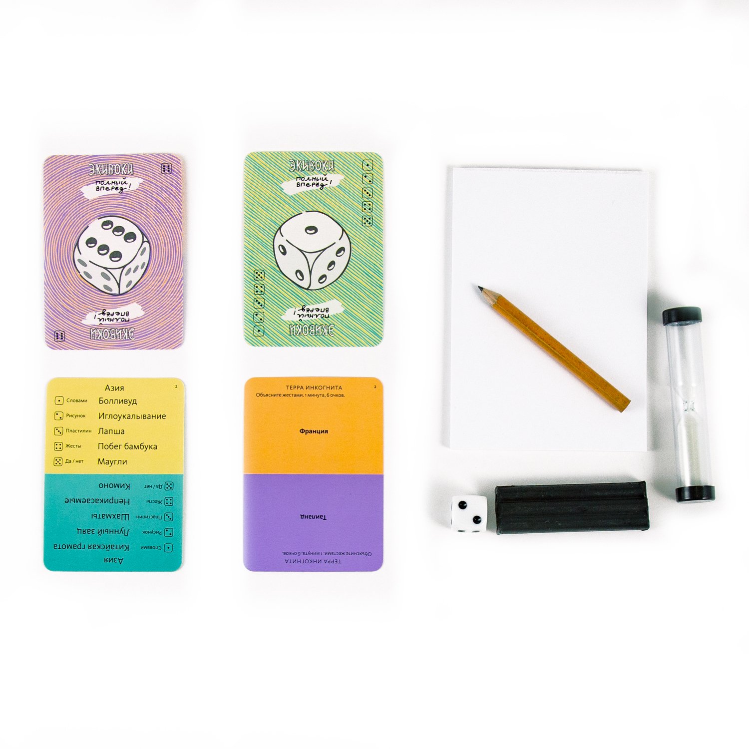 «Экивоки. Полный вперед !» особенно порадует тех, кто любит путешествовать с детьми или компанией друзей. Темы: «Азия», «Европа», «Африка», «Моря и океаны». Заданий столько, что хватит на полёт от Москвы до Рио-де-Жанейро! Коробочка карманного размера содержит 72 карточки с заданиями и все необходимое для игры. В этой версии нет игрового поля, вместо него блокнот для подсчета очков. Играть можно компанией или вдвоем, а если желающих много – разделившись на команды.