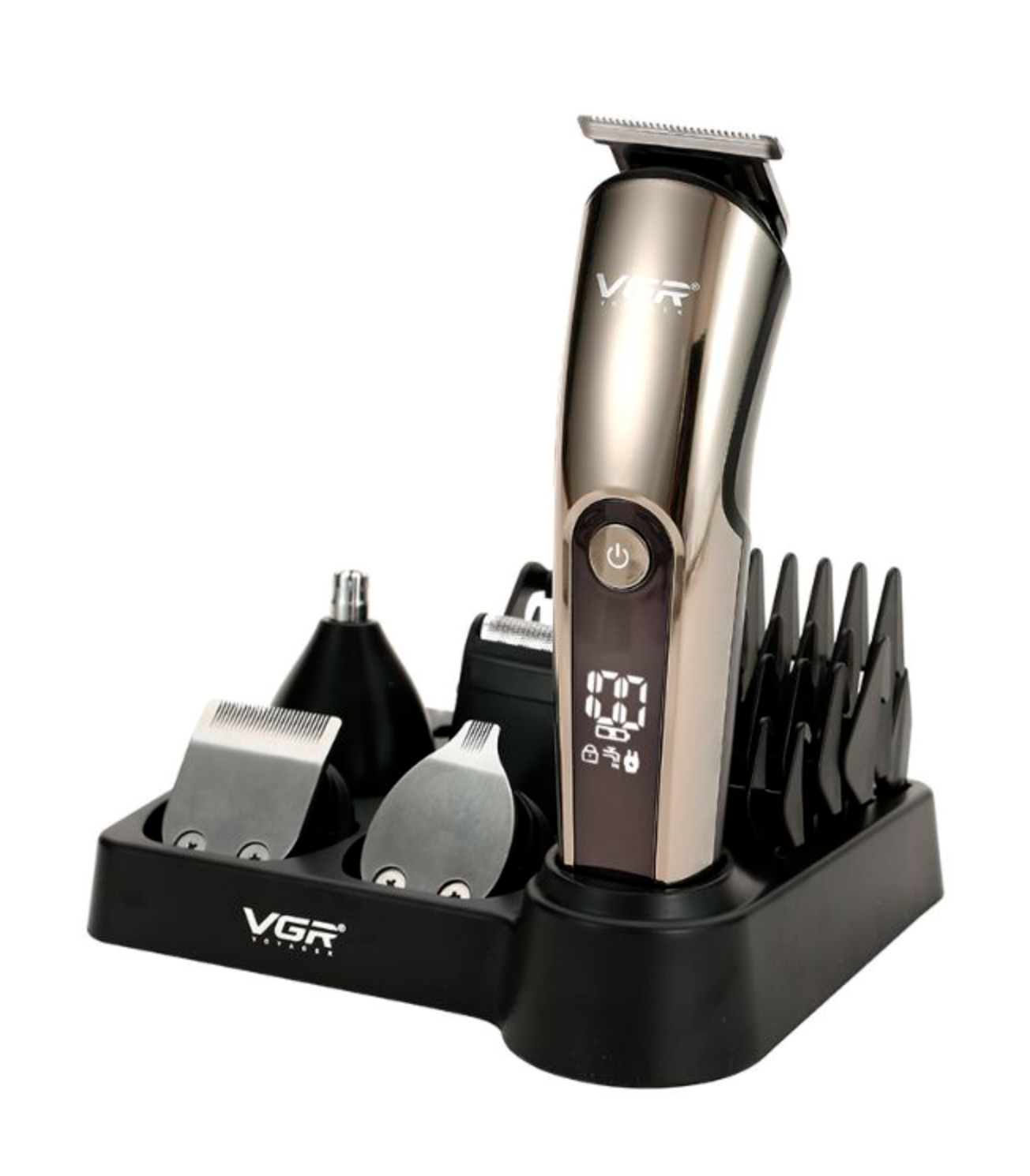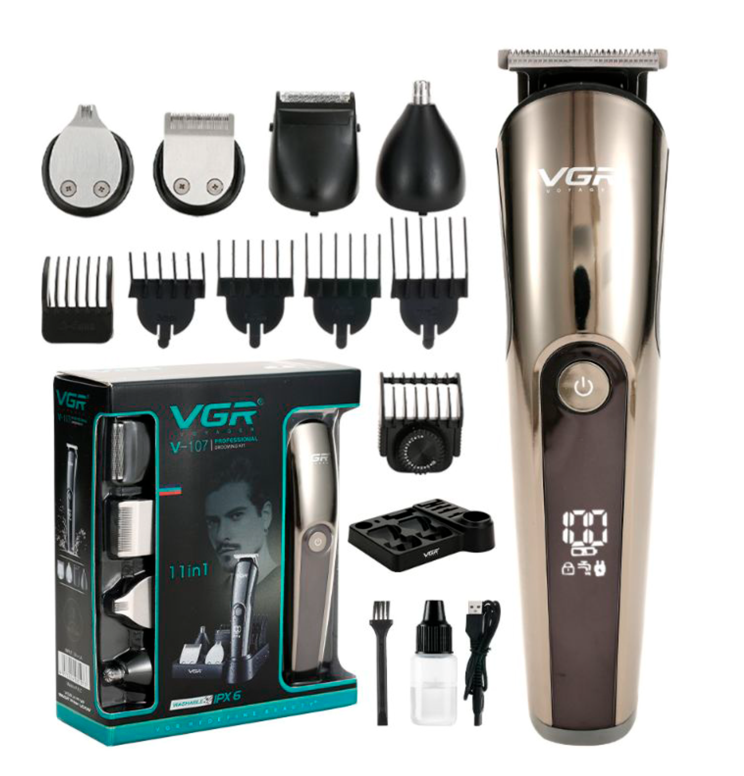 Профессиональный набор для стрижки VGR V-107 11 в 1 представляет собой многофункциональный комплект для полноценного ухода за волосами, бородой и телом. Устройство оснащено ЖК-дисплеем, который позволяет контролировать уровень заряда и состояние масла, делая использование максимально удобным.