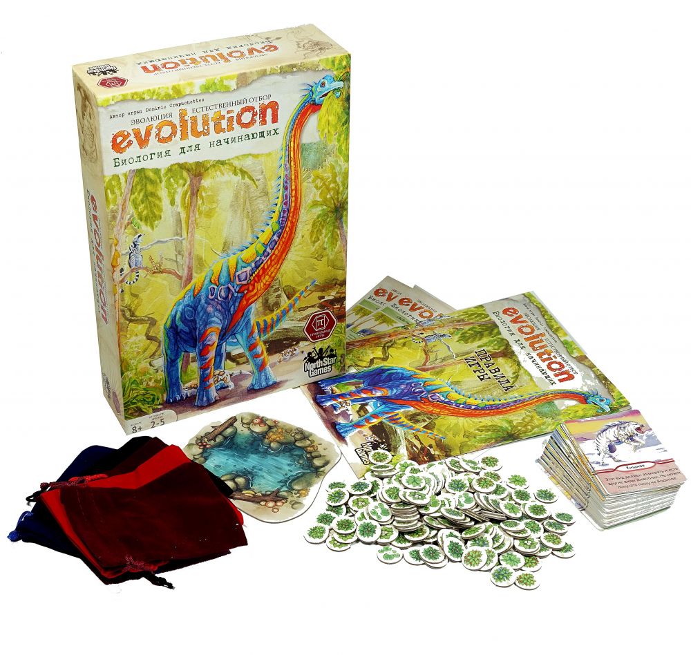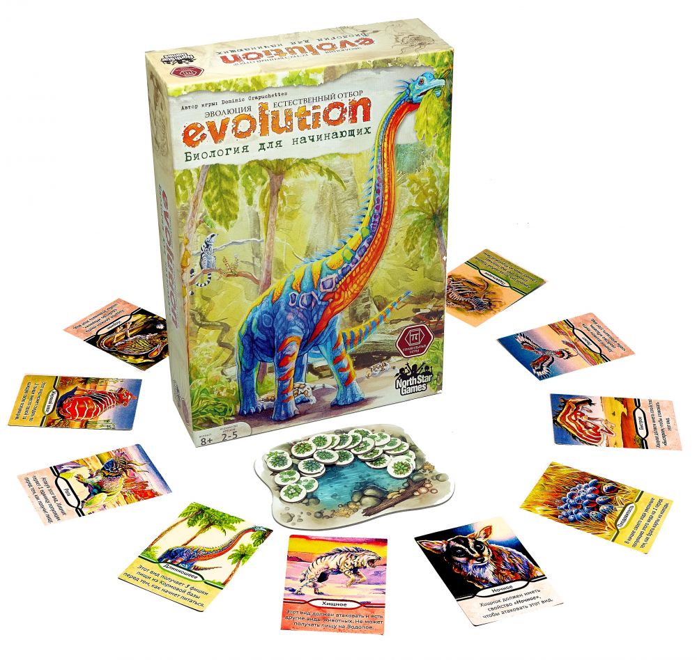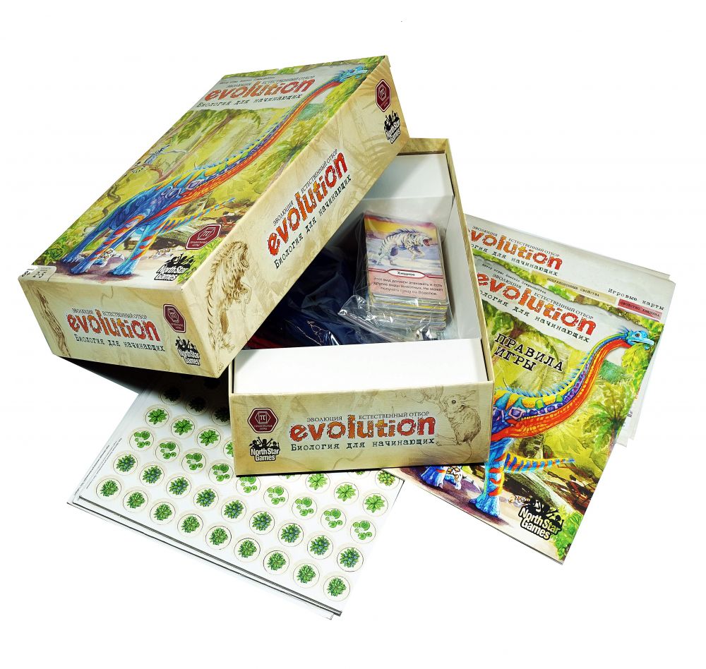 Эволюция. Биология для начинающих предназначена для юных любителей биологии и настолок. Это самостоятельная игра, несовместимая с другими эволюционными играми, хотя дизайн ее сделан в стиле Естественного отбора. В нее хорошо играть всей семьей.
