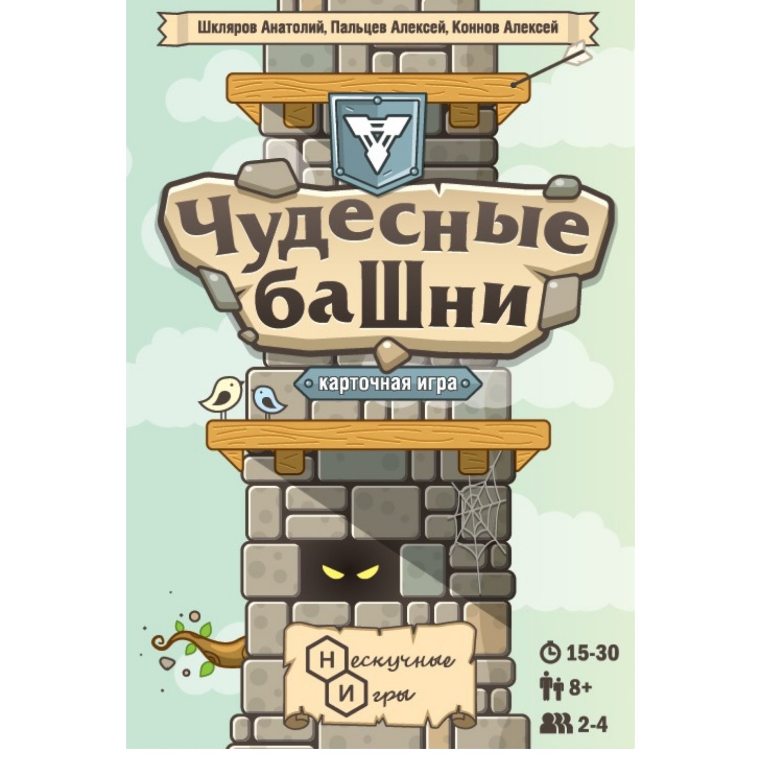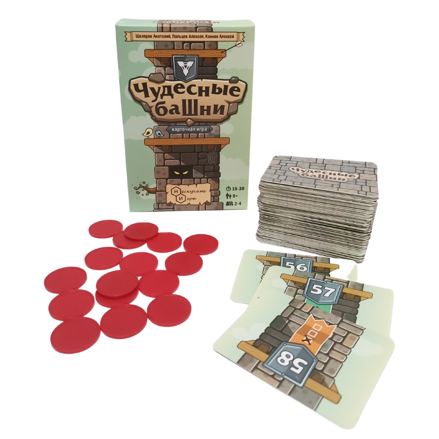 Чудесные башни" - карточная игра, для победы в которой нужно перевернуть свою башню с головы на ноги. Каждый игрок получает 7 карт из колоды и строит из них перевёрнутую башню (выкладывая карты в порядке возрастания их номеров). Ещё одна карта колоды вскрывается и становится общей.