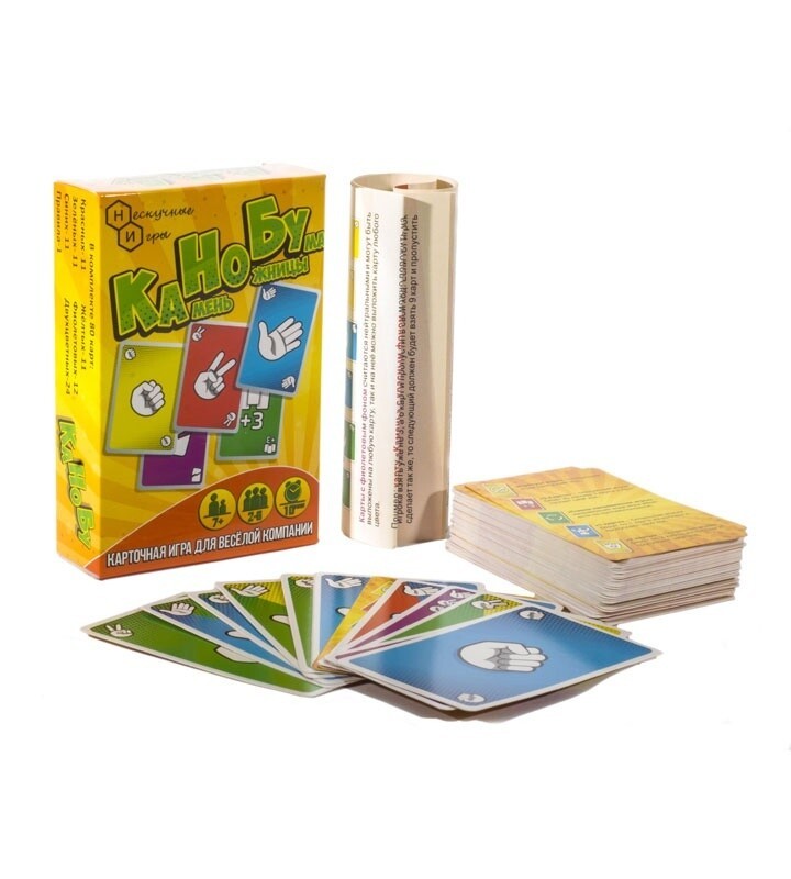 Цель игры: первым избавится от своих карт. В состав игры входят карты разного цвета с разными значками: - одноцветные и двухцветные карты с изображением камня, ножниц и бумаги; - одноцветные специальные карты действий - "Пропуск хода", "Смена направления", "Возьми 3", ... - фиолетовые карты действий - "Отмена", "Смена цвета",... Перед началом игры каждый игрок получает по 6 карт. В свой ход игрок может выложить карту в колоду сброса по следующим правилам: - Карты "Камень", "Ножницы", "Бумага" можно выложить если они совпадают по цвету фона (хотя бы одному, в случае двухцветных карт), а также "бьют" ранее выложенную карту (камень на ножницы, ножницы на бумагу, бумагу на камень). Также их можно выкладывать на специальные карты того же цвета или на фиолетовые карты. - Специальные карты можно выкладывать на карты того же цвета или фиолетовые карты. Большое количество специальных карт делают игру азартной и непредсказуемой. Вы сможете вынуждать соперников брать дополнительные карты и пропускать ход, но в любой момент эти же действия могут быть перенаправлены на Вас. Игра Канобу будет интересна и детям и взрослым, отличный вариант для семейный посиделок, поездок, детских праздников.