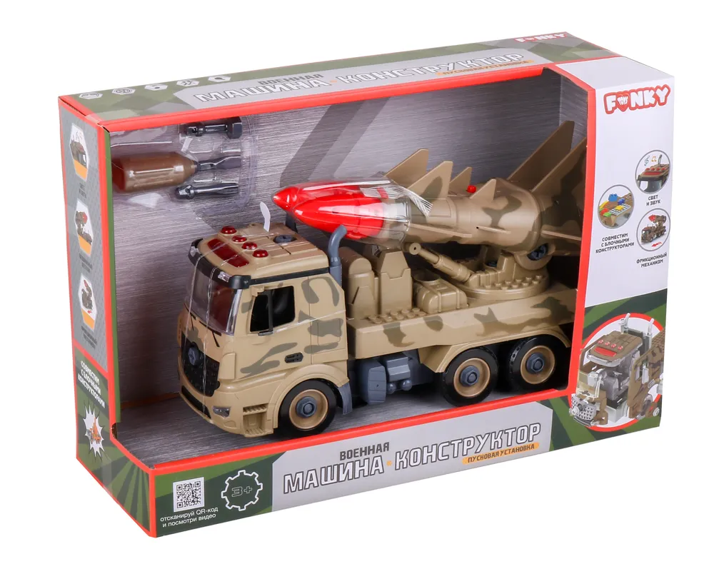 Комплект: машина-конструктор, отвертка с 3 насадками, свет, звук. Внимание! Использовать только под непосредственным наблюдением взрослых.