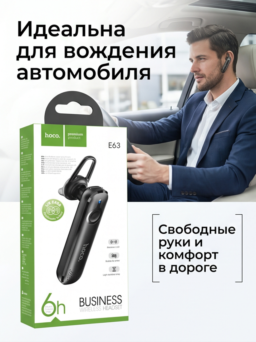 Hoco E63 — незаменимый аксессуар для автомобиля. Функция «свободные руки» (Hands-free) позволяет принимать звонки, не отвлекаясь от дороги, обеспечивая вашу безопасность. Гарнитура поддерживает голосовые подсказки на английском и китайском языках (переключение двойным кликом на многофункциональную кнопку в режиме без сопряжения).