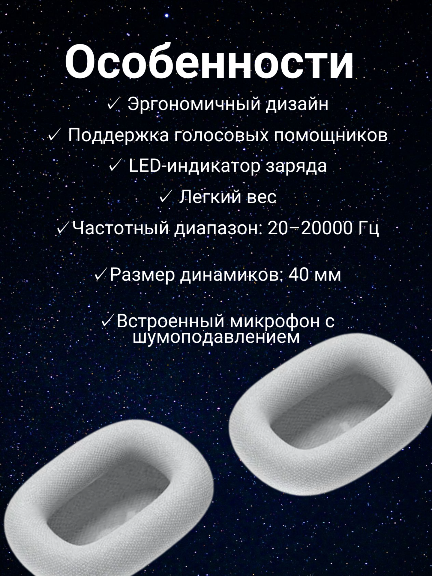 Наушники оснащены съёмными амбушюрами из мягкой ткани, которые можно легко заменить при необходимости. Для удобства использования предусмотрена голосовая система подсказок на китайском и английском языках, активируемая двойным нажатием кнопки питания.