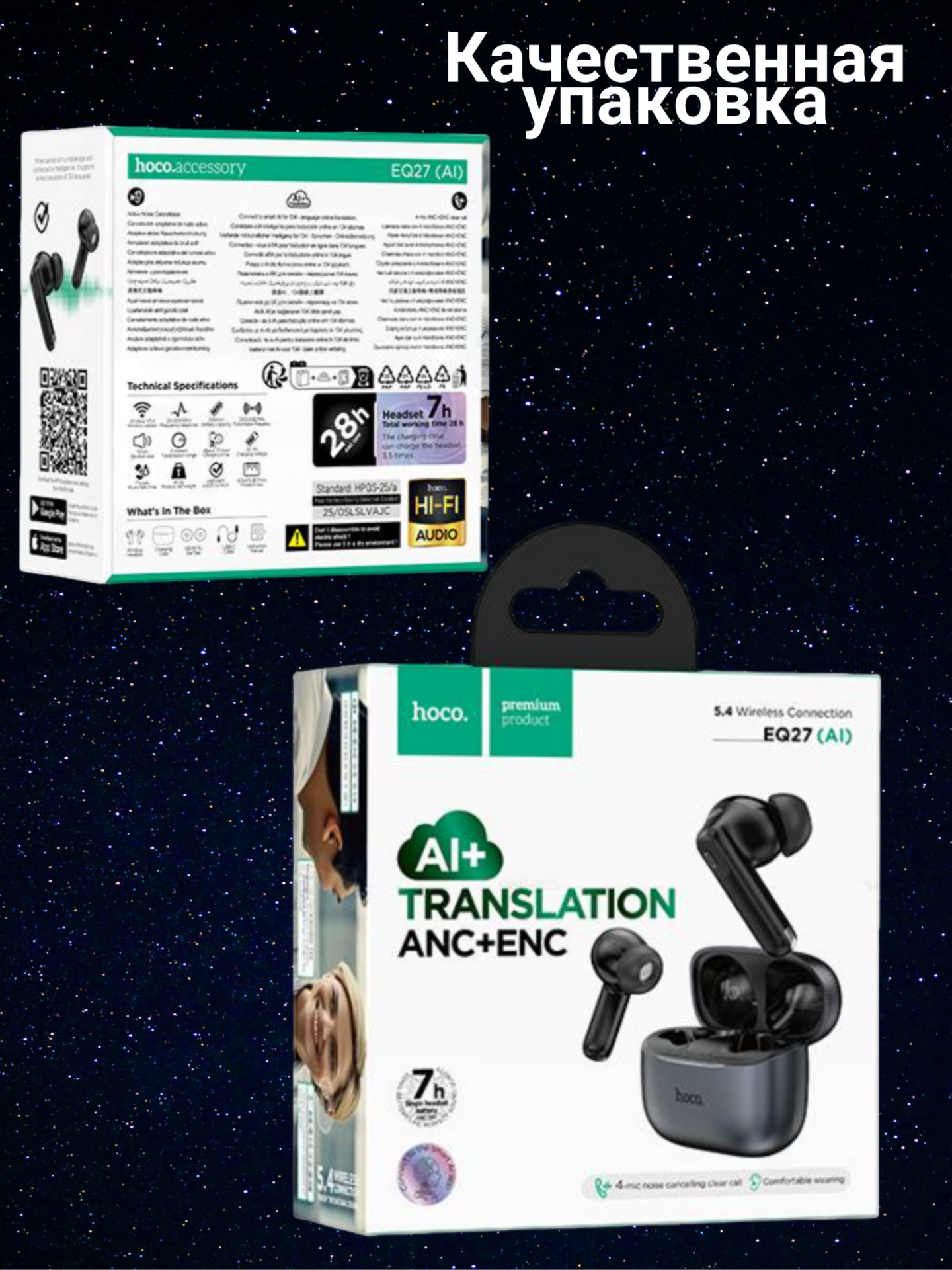 Для работы переводчика нужно использовать специальное приложение на телефоне (AI Smart Tool) и необходим доступ к интернету. Hoco EQ27 — это инновационные беспроводные наушники с встроенным искусственным интеллектом и функцией мгновенного перевода на 134 языка. Устройство сочетает в себе передовые технологии шумоподавления и современные функции для комфортного использования.