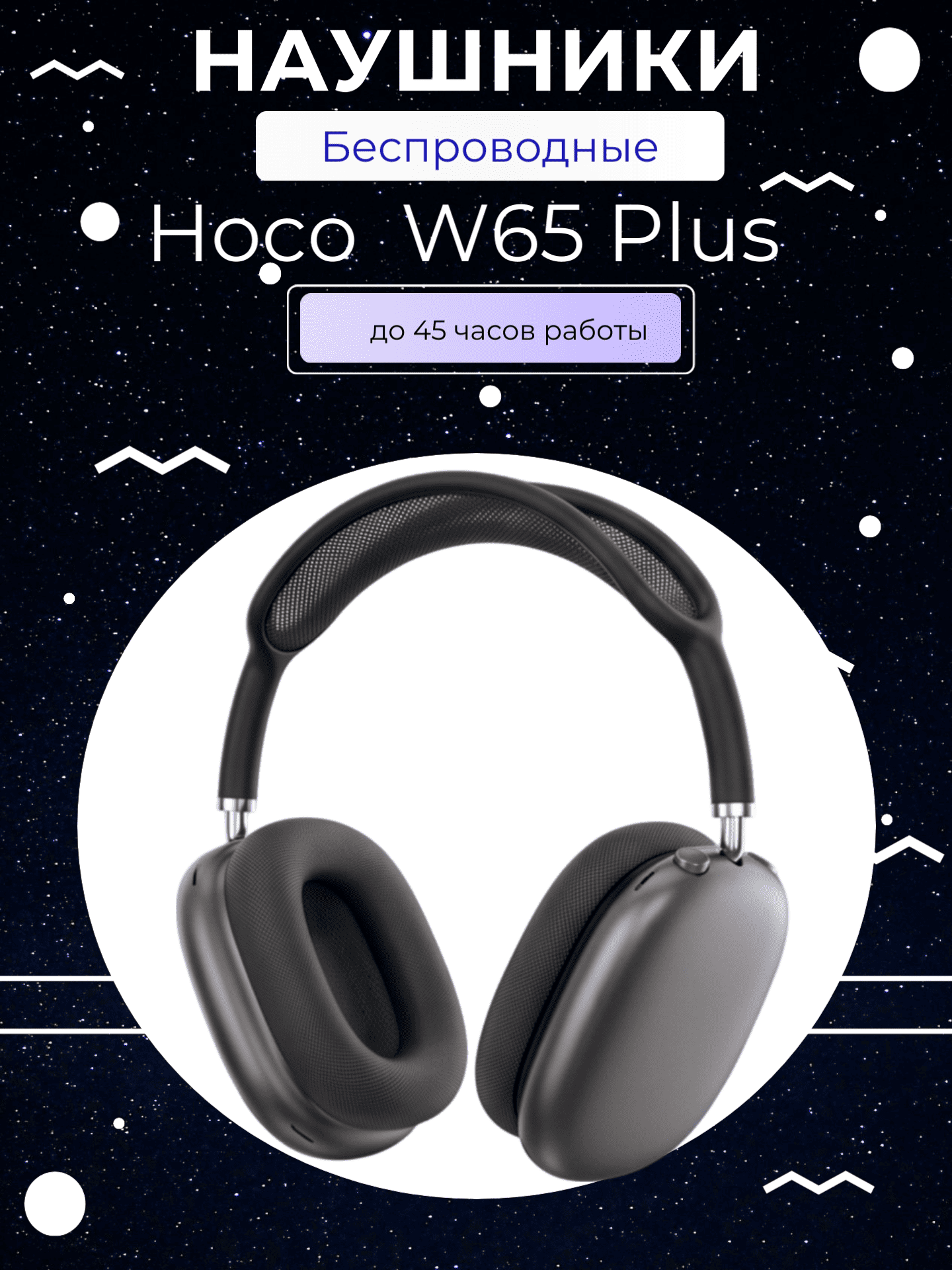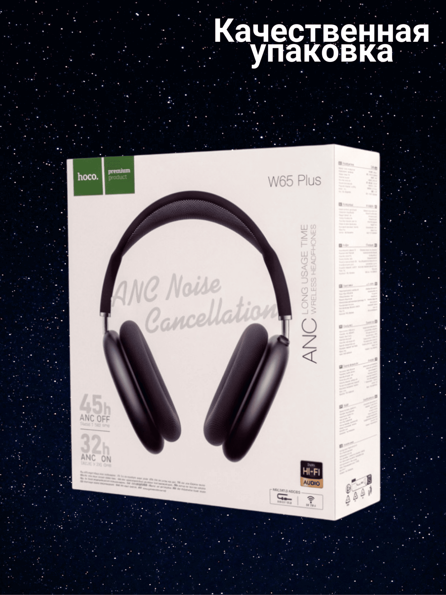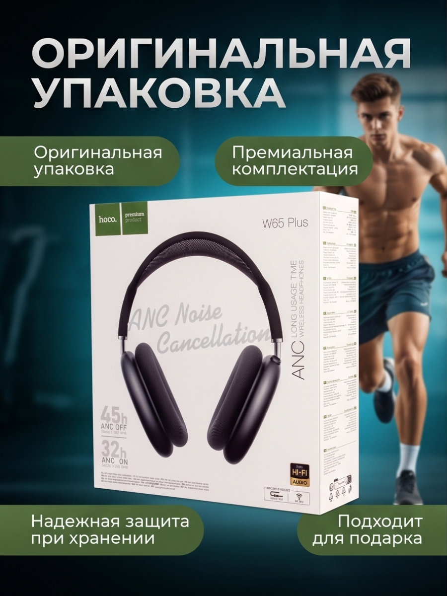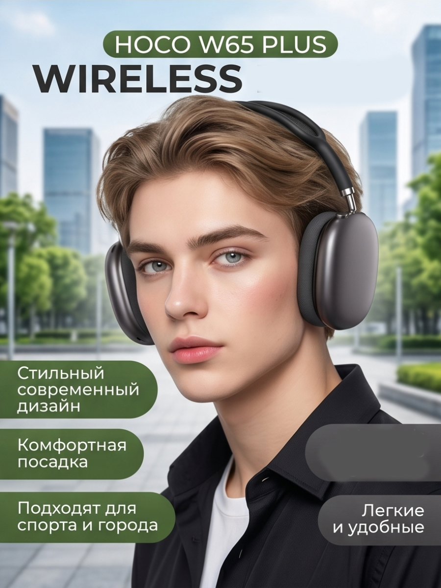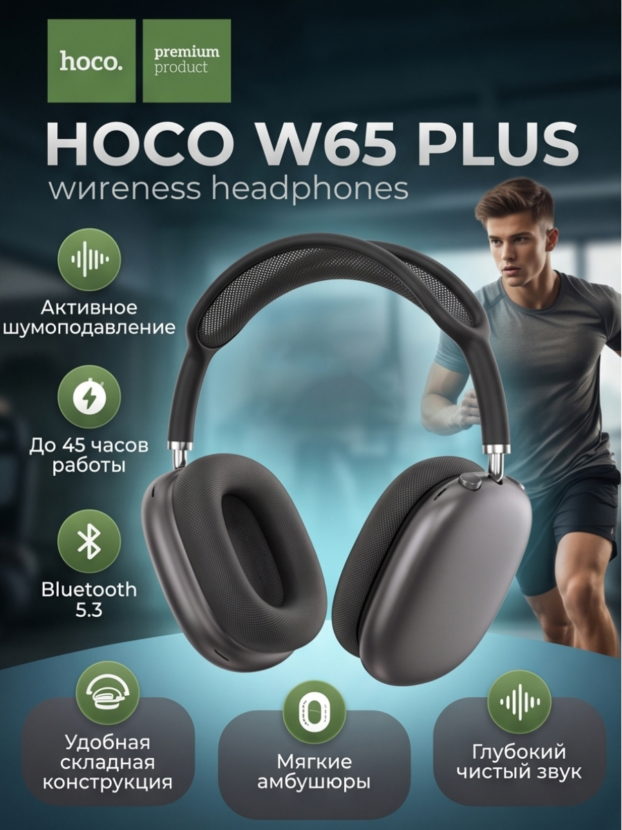 Наушники с шумоподавлением W65 Plus HOCO Wireless Headphones — стильные беспроводные накладные наушники в сером цвете для музыки, работы, спорта, учебы и повседневного использования. Модель сочетает современный дизайн, удобную посадку и качественный звук с глубокими басами и четкими высокими частотами. Активное шумоподавление помогает снизить внешний шум и сосредоточиться на любимом треке, звонке или подкасте даже в шумной обстановке.