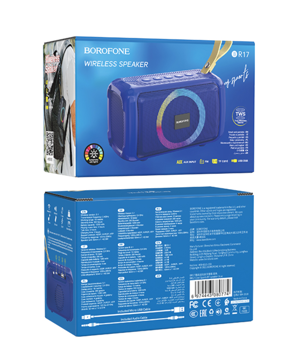 Универсальность Borofone BR17 проявляется в многообразии способов подключения. Вы можете транслировать музыку по Bluetooth, слушать радио через FM‑приёмник, вставлять TF‑карты или USB‑накопители, а также использовать AUX‑вход для проводного подключения. А если у вас есть вторая такая же колонка, можно объединить их в стереосистему через режим TWS — звук станет ещё объёмнее и выразительнее.